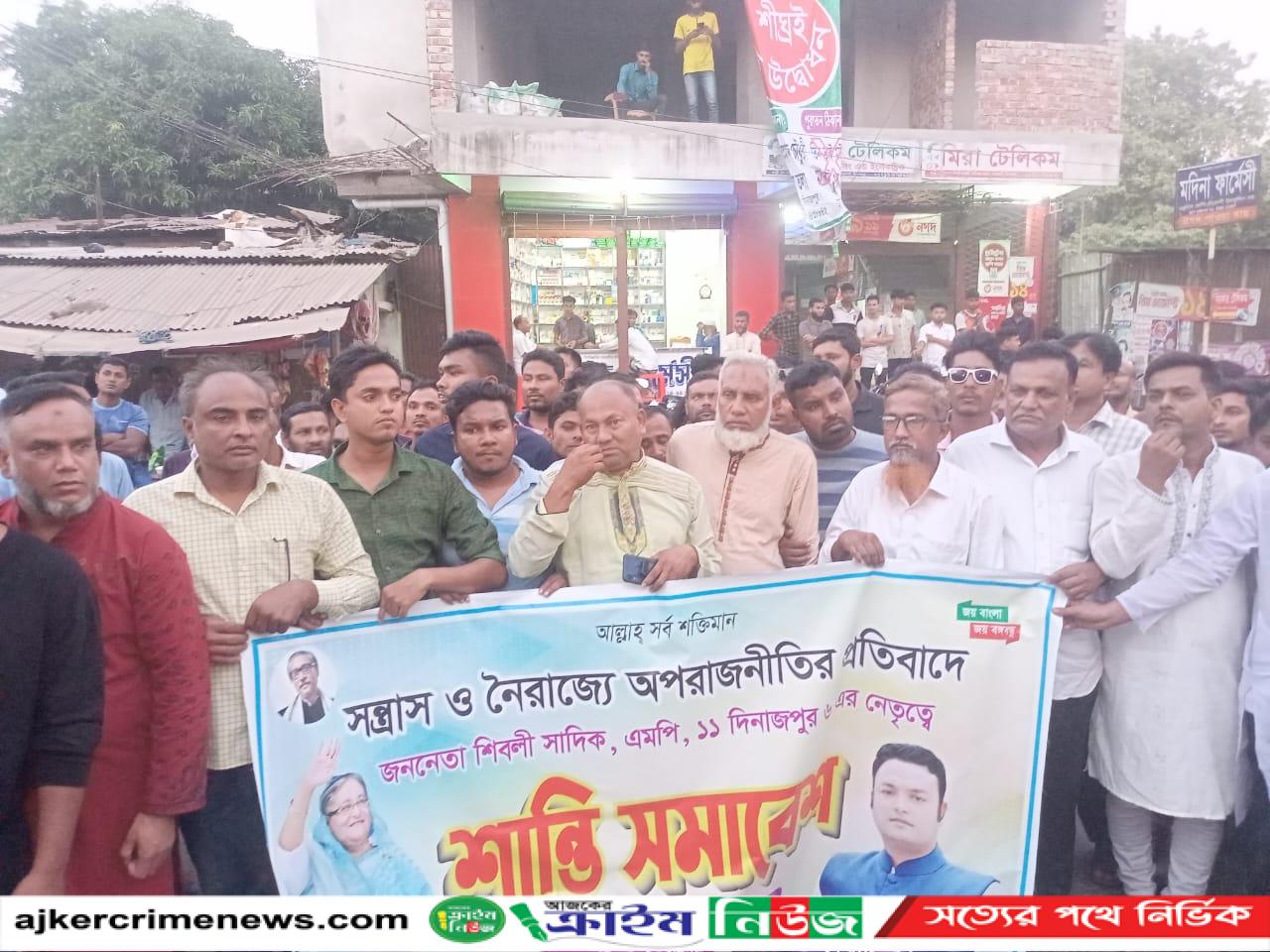 দিনাজপুর ৬ আসনের জাতীয় সংসদ সদস্য শিবলী সাদিকের নির্দেশনায় ২৯ অক্টোবর বিকালে ঘোড়াঘাটে উপজেলা আওয়ামীলীগ, উপজেলা কৃষকলীগ, শ্রমিকলীগ, যুবলীগ, ছাত্রলীগ ও সহযোগী অঙ্গসংগঠনের উদ্যোগে ঘোড়াঘাট আঞ্চলিক মহাসড়কে রাণীগঞ্জ বাজারে বিএনপির হত্যা,জ্বালাও পোড়াও,নৈরাজ্য ও হরতালের প্রতিবাদে এক শান্তি মিছিল ও সমাবেশ অনুষ্ঠিত হয়েছে।