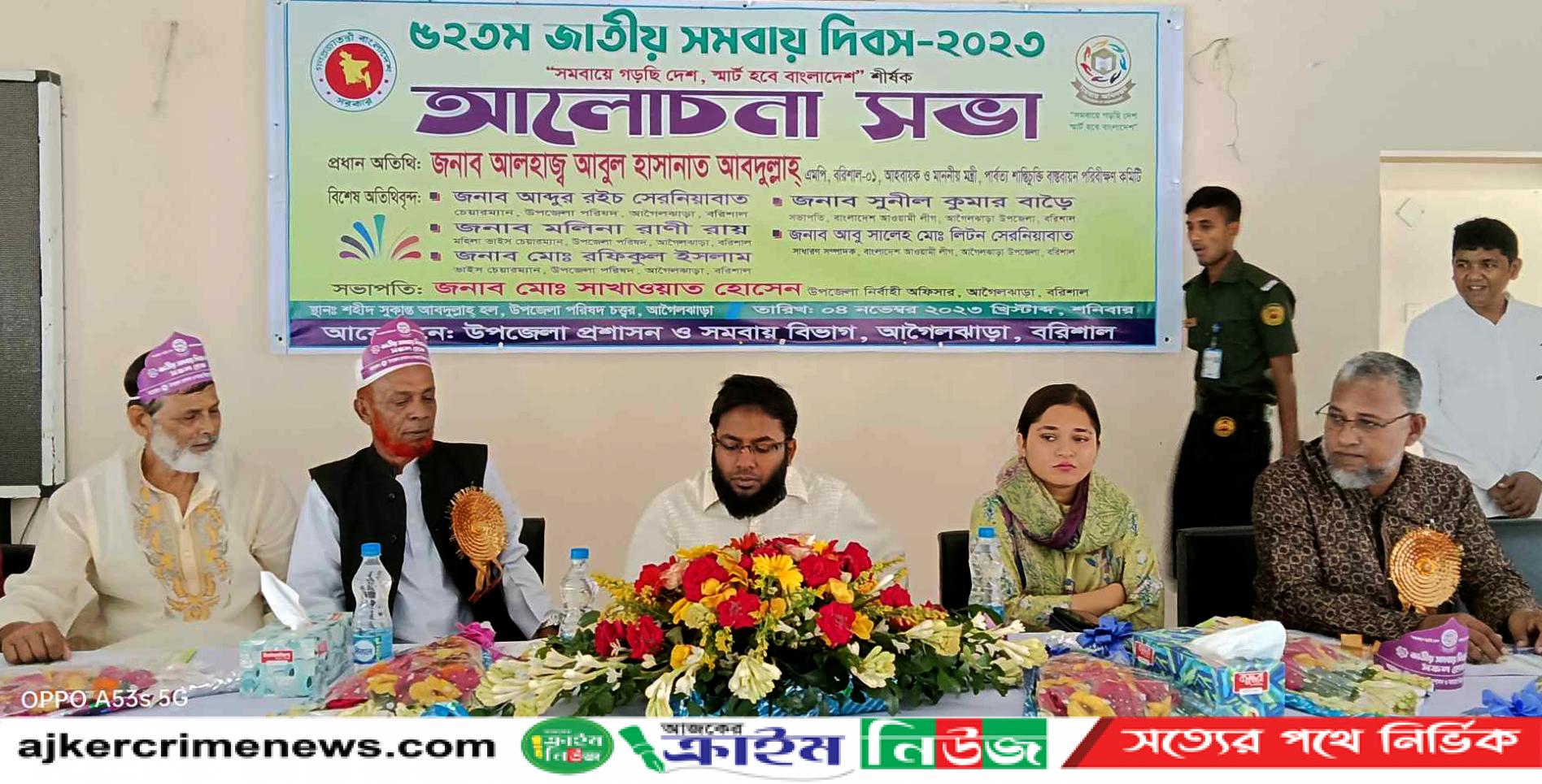 “সমবায়ে গড়ছি দেশ, স্মার্ট হবে বাংলাদেশ” এই প্রাতিপাদ্য বিষয়কে সামনে রেখে বরিশালের আগৈলঝাড়ায় ৫২তম জাতীয় সমবায় দিবস পালন করা হয়েছে।উপজেলা প্রশাসন ও সমবায় অধিদপ্তরের উদ্যেগে শনিবার সকালে উপজেলা পরিষদ চত্তরে জাতীয় সংগীত পরিবেশনের মাধ্যমে জাতীয় পতাকা ও সমবায় পাতাকা উত্তোলন করেন অতিথিরা। পরে সমবায়ীদের নিয়ে র্যালী শেষে উপজেলার শহীদ সুকান্ত আবদুল্লাহ হল রুমে উপজেলা নির্বাহী অফিসার মোঃ সাখাওয়াত হোসেন এর সভাপতিত্বে দিবসের আলোচনাসভা অনুষ্ঠিত হয়। অন্যান্যদের মধ্যে আরও বক্তব্য রাখেন উপজেলা সহকারী কমিশনার (ভূমি) উম্মে ইমামা বানিন, সমবায় অফিসার (অ.দ্বা) মোঃ আমিনুল ইসলাম।অনুষ্ঠান শেষে শ্রেষ্ঠ সমবায় সমিতির লিঃ হিসেবে চারটি প্রতিষ্ঠান, শ্রেষ্ঠ সমবায়ী হিসেবে চারজন এবং শ্রেষ্ঠ ম্যানেজার হিসেবে চারজনকে ক্রেষ্ট বিতরণ করেন অতিথিরা।
