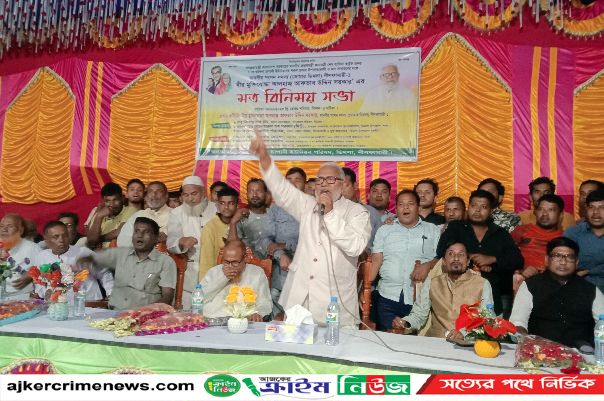 সুজন মহিনুল।।নীলফামারীর ডিমলায় সরকারের সকল প্রকার সুবিধাভোগী ও জন সাধারণের সাথে এমপির মতবিনিময় সভা অনুষ্ঠিত হয়েছে।শনিবার(৪ নভেম্বর)বিকেল পাঁচটায় উপজেলার খালিশা চাপানী ইউনিয়ন পরিষদের আয়োজনে উক্ত ইউনিয়ন পরিষদ সংলগ্ন ডালিয়া দ্বি-মূখি উচ্চ বিদ্যালয় মাঠে এই মতবিনিময় সভা অনুষ্ঠিত হয়।এতে প্রধান অতিথি হিসেবে উপস্থিত ছিলেন, নীলফামারী-১(ডোমার-ডিমলা)আসনের সংসদ সদস্য বীর মুক্তিযোদ্ধা আলহাজ্ব আফতাব উদ্দিন সরকার।খালিশা চাপানী ইউনিয়ন পরিষদ চেয়ারম্যান সহিদুজ্জামান সরকারের সভাপতিত্বে ও ইউনিয়ন আওয়ামী লীগের সহ-সভাপতি তামজিদার রহমান তামজিদের সঞ্চালনায় বিশেষ অতিথি হিসেবে উপস্থিত থেকে বক্তব্য দেন,উপজেলা আওয়ামী লীগের সাধারণ সম্পাদক আনোয়ারুল হক সরকার মিন্টু, সহ-সভাপতি ও উপজেলা ভাইস চেয়ারম্যান নিরেন্দ্রনাথ রায়,খালিশা চাপানী ইউনিয়ন আওয়ামী লীগের সভাপতি সোহরাফ হোসেন,ইউনিয়নটির সাবেক চেয়ারম্যান ইসমাইল হোসেন,৭ নম্বর ওয়ার্ডের ইউপি সদস্য সেলিমুর রহমান।সভায় সরকারের বিভিন্ন সুবিধাভোগী,জনপ্রতিনিধি,আওয়ামী লীগ ও তার অঙ্গ সংগঠনের নেতাকর্মীরা ছাড়াও বিভিন্ন শ্রেণী-পেশার মানুষজন উপস্থিত ছিলেন।