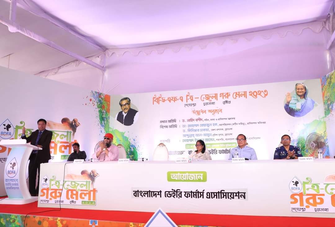 শুক্রবার বেলা ১১ টায় চুয়াডাঙ্গা টাউন ফুটবল মাঠে বাংলাদেশ ডেইরি ফার্মস অ্যাসোসিয়েশনের সভাপতি মোহাম্মদ ইমরান হোসেনের সভাপতিত্বে প্রধান অতিথি হিসেবে উপস্থিত ছিলেন মৎস্য ও প্রাণী সম্পদ মন্ত্রণালয়ের সচিব ড.নাহিদ রশীদ। প্রদান অতিথি তার বক্তব্যে বলেন,আমাদের ডেইরি ফার্ম আজ অন্যান্যদের চাইতে অনেক এগিয়ে। এফার্ম মালিকরা লাভবান হবে যদি তারা পরিকল্পনা মাফিক এগিয়ে নিতে পারে।এসময় বিশেষ অতিথি হিসেবে উপস্থিত ছিলেন প্রাণিসম্পদ অধিদপ্তরের মহাপরিচালক (রুটিন দায়িত্ব) ডাঃ মোহাম্মদ রেয়াজুল হক চুয়াডাঙ্গা জেলা প্রশাসক ড. কিসিঞ্জার চাকমা,চুয়াডাঙ্গা পুলিশ সুপার আব্দুল্লাহ্ আল-মামুন। মেলায় মেহেরপুর, চুয়াডাঙ্গা ও কুষ্টিয়া জেলা হতে অংশগ্রহনকারী বিভিন্ন ফার্মের খামারিরা উপস্থিত ছিলেন। মেলা কমিটিরি আহ্বায়ক হাজ্জাজ আলী জানান, মেলায় চুয়াডাঙ্গা, মেহেরপুর ও কুষ্টিয়ার রেজিস্ট্রেশন ভুক্ত খামারীদের গরু প্রদর্শন, বিক্রি ও স্বাস্থ্যসম্মত উপায়ে গরু মোটাতাজাকরণ বিষয়ে প্রশিক্ষণ দেওয়া হবে। এ তিন জেলা থেকে প্রথম দিনে দেশী-বিদেশী উন্নত জাতের ২৫২টি গরু রেজিস্ট্রেশনভুক্ত করা হয়েছে।