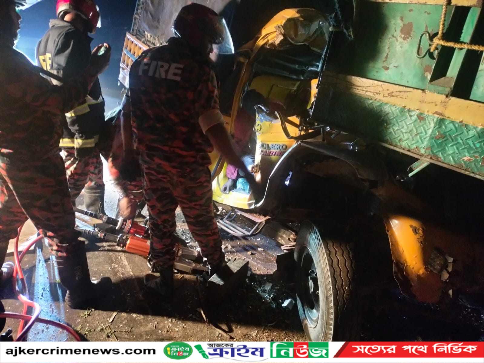 শফিকুল ইসলাম দিনাজপুর জেলা প্রতিনিধিঃ দিনাজপুরের ফুলবাড়ী উপজেলার ২৯ বিজিবি ক্যাম্পের ১ নং গেটের সামনে ১০শে নভেম্বর শুক্রবার ভোর ৪টায় ঢাকাগামী একটি কভার ভ্যানের বাম পাশের চাকা পামচার হয়ে যাওয়ায় কভার ভ্যানটির চালক ঝুকিপূর্ণ অবস্থায় গাড়িটি পার্শে দাঁড়ানোর চেস্টা করেন । এমন সময় পিছনদিক থেকে দ্রুতগতিতে ছুটে আসা একটি ধান ভর্তি ট্রাক কভার ভ্যানের পিছনে ধাক্কা দেয়। একই সময়ে ঠাকুরগাঁ থেকে ছেড়ে আসা একটি মুরগি ভর্তি পিকআপ দ্রুত গতিতে ছুটে এসে ধান ভর্তি ট্রাকের পিছনে স্বজোরে ধাক্কা লাগলে ঘটনাস্থলে মুরগী ভর্তি পিকাপের ড্রাইভারসহ দুইজন চাপালেগে ঘটনাস্থলেই মৃত্যুবরণ করেন।খোজনিয়ে যানাযায় ড্রাইভার ঠাকুরগাঁও জেলার জগন্নাথপুর বাঙালি পাড়া গ্রামের ফয়েজ উল্লাহ ছেলে নায়েব আলী (৪৫) ও হেলপার একই গ্রামের মকবুল হোসেনের ছেলে শফিউল জামান ( ২৮) খবর পেয়ে ফুলবাড়ী থানা পুলিশ ও ফায়ার সার্ভিসের কর্মীরা ঘটনাস্থলে এসে দ্রুত উদ্ধার কার্যক্রম পরিচালনা করেন এবং নিহতের লাশ ফুলবাড়ি থানায় নিয়ে যায়।