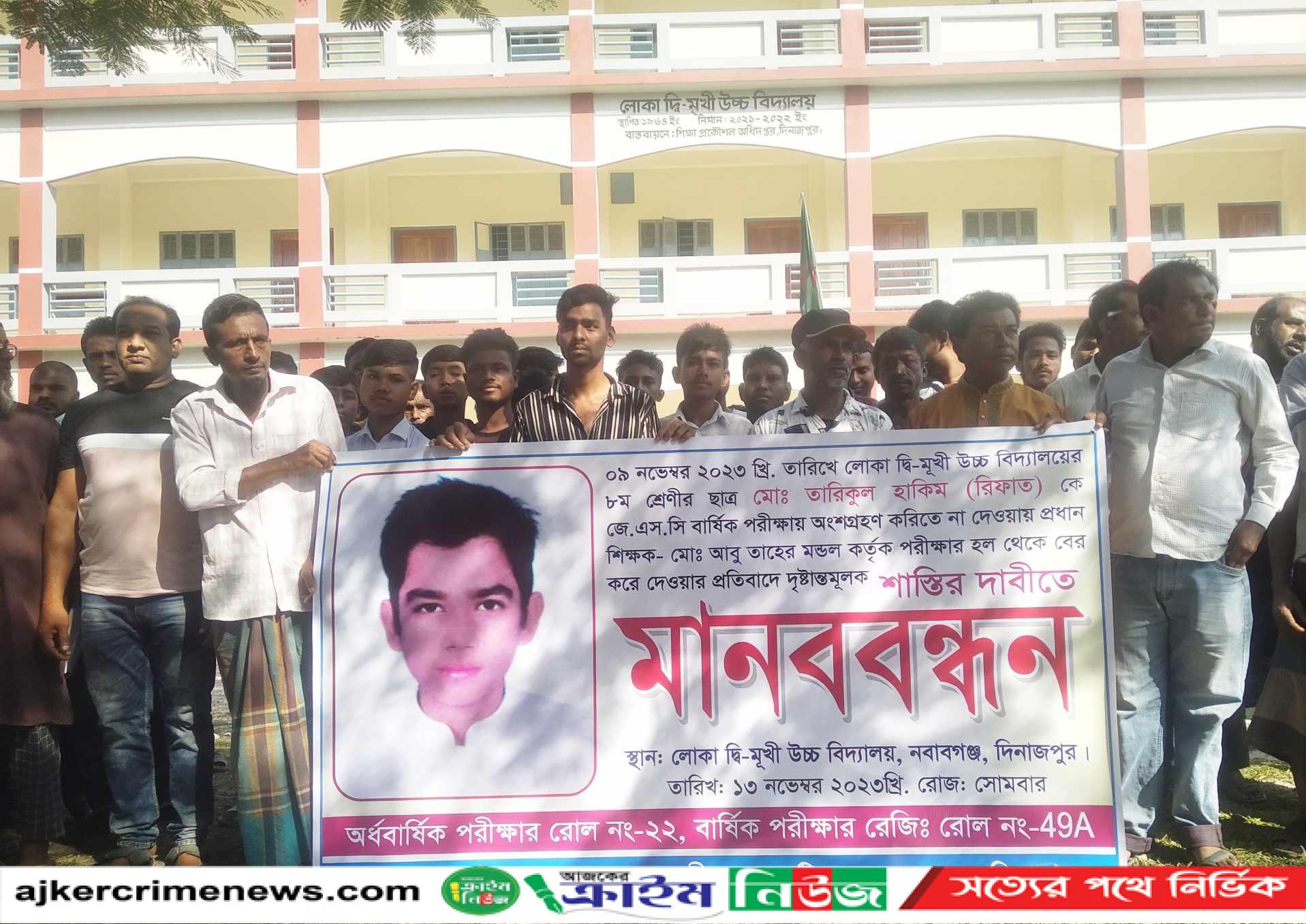 দিনাজপুরের নবাবগঞ্জ উপজেলার পুঁটিমারা ইউনিয়নের লোকা দ্বি-মূখী উচ্চ বিদ্যালয়ে অষ্টম শ্রেণীর শিক্ষার্থী তারিকুল হাকিম রিফাতকে জে,এস,সি বার্ষিক পরীক্ষায় অংশগ্রহন করতে না দেয়ায় ও পরীক্ষার হল থেকে বের করে দেয়ার প্রতিবাদে ওই বিদ্যালয়ের প্রধান শিক্ষক মোঃ আবু তাহের মন্ডল এঁর দৃষ্টান্তভূলক শাস্তির দাবীতে বিদ্যালয়ের সকল শিক্ষার্থী, শিক্ষার্থীদের অভিভাবক ও এলাকাবাসি মানববন্ধন করেছেন।