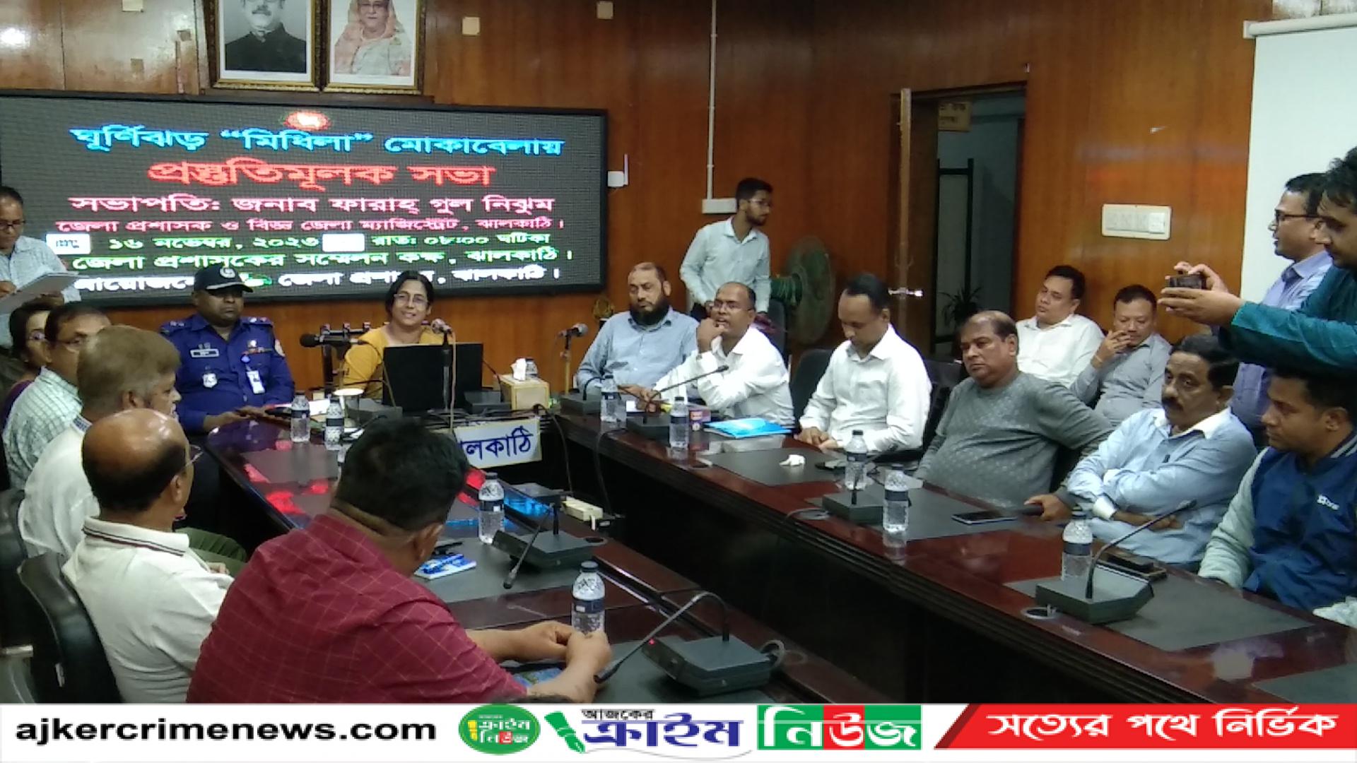 ঝালকাঠি প্রতিনিধি : জেলা প্রশাসকের সম্মেলন কক্ষে বৃহস্পতিবার ১৬ ই নভেম্বর রাত ৮ টায় ঘূর্ণিঝড় (মিধিলি) মোকাবেলায় ও জানমালের ক্ষতি কমাতে জেলা দুর্যোগ ব্যবস্থাপনা কমিটির এক জরুরী সভা অনুষ্ঠিত হয়েছে। সভায় সভাপতিত্ব করেন জেলা প্রশাসক ফারাহ্ গুল নিঝুম জেলা প্রশাসক বলেন ঘূর্ণিঝড় “মিধিলি” এর কারণে জানমালের ক্ষতি কমাতে ঝালকাঠি জেলা প্রশাসনের পক্ষ থেকে সব ধরণের প্রস্তুতি নেয়া হয়েছে। বিশেষ অতিথি পুলিশ সুপার মোহাম্মদ আফরুজুল হক টুটুল বলেন, ঘুর্ণিঝড় "মিধিলি" মোকাবেলায় পূর্বের প্রতিটি দূর্যোগের ন্যায় আমাদের সতর্ক থাকতে হবে।