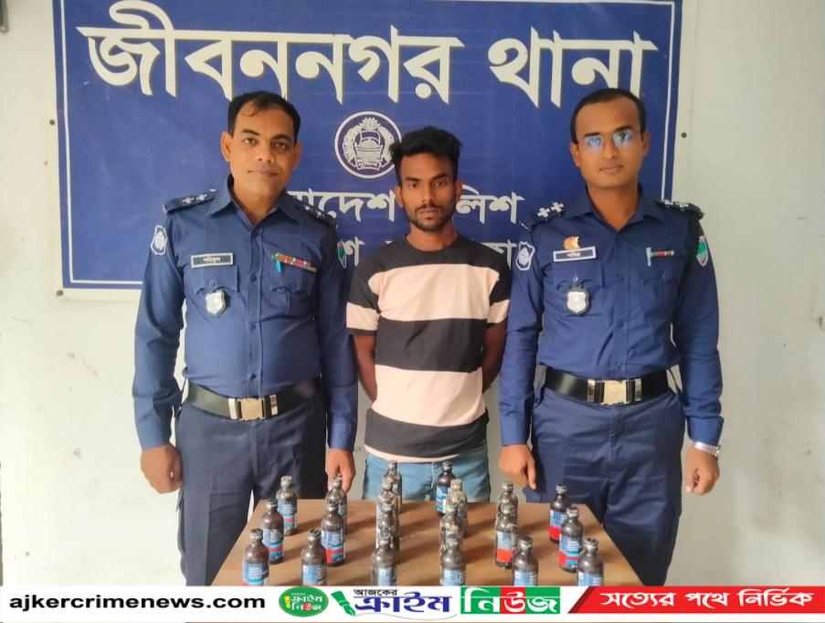 বুধবার সকাল১০ টায় জীবননগর থানার অফিসার ইনচার্জ (ওসি) এস এম জাবীদ হাসানের নেতৃত্বে এসআই এসএম রায়হানসহ সঙ্গীয় ফোর্স গোপন সংবাদের ভিত্তিতে ধান্যখোলা গ্রামে মাদক বিরোধী অভিযান চালান।এসময় ধান্যখোলা মাঝপাড়া হতে একই এলাকার বেনিপুর গ্রামের লাবলু হোসেনের ছেলে রাজিব(৩৫) কে আটক করে তার দেহ তল্রাসী করে।পরে তার দেহে বিশেষ কায়দায় রাখা ২১ বোতল ফেনসিডিল উদ্ধার হয়।পুলিশ জানান, গ্রেপ্তারকৃত আসামির বিরুদ্ধে জীবননগর থানায় মাদকদ্রব্য নিয়ন্ত্রণ আইনে মামলা রুজু করা হয়েছে।