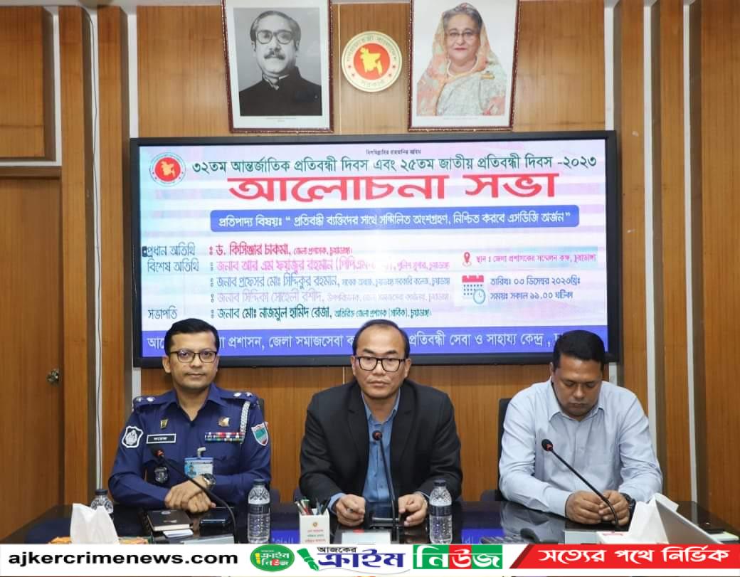 "প্রতিবন্ধী ব্যক্তিদের সাথে সম্মিলিত অংশগ্রহণ, নিশ্চিত করবে এসডিজি অর্জন" প্রতিপাদ্য বিষয়কে সামনে রেখে ৩২তম আন্তর্জাতিক প্রতিবন্ধী দিবস এবং ২৫তম জাতীয় প্রতিবন্ধী দিবস-২০২৩ উপলক্ষে এ আলোচনা সভা অনুষ্ঠিত হয়। পরে অসহায় প্রতিবন্ধীদের মাঝে হুইল চেয়ার প্রদান করা হয়।