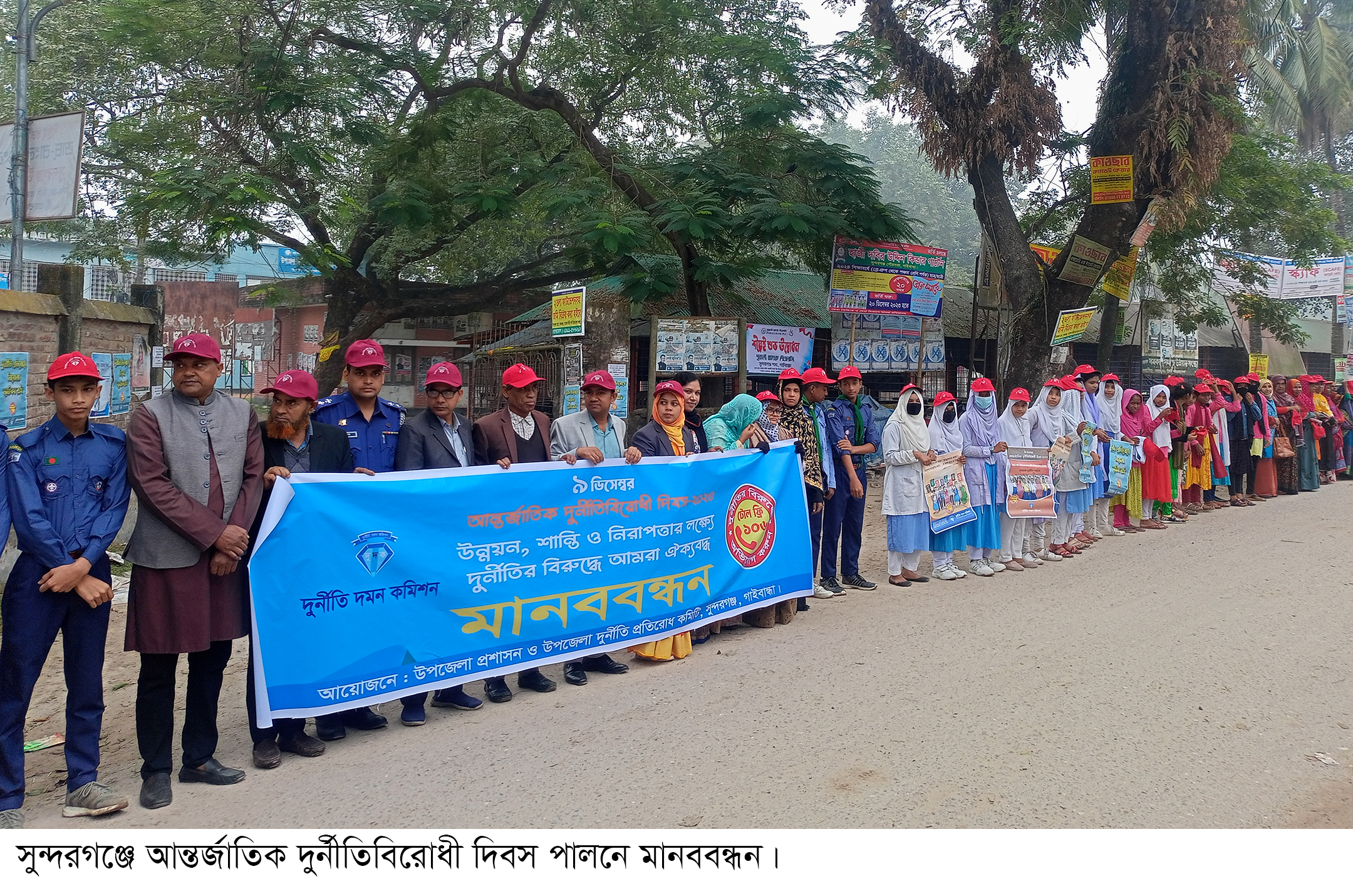 'উন্নয়ন, শান্তি ও নিরাপত্তার লক্ষ্যে "দুর্নীতির বিরুদ্ধে আমরা ঐক্যবদ্ধ"এ প্রতিপাদ্যকে সামনে রেখে গাইবান্ধার সুন্দরগঞ্জে আন্তর্জাতিক দুর্নীতিবিরোধী দিবস পালনে মানববন্ধন ও আলোচনা সভা অনুষ্ঠিত হয়েছে। গতকাল শনিবার সকাল ১০ টার দিকে উপজেলা প্রশাসন ও দুর্নীতি প্রতিরোধ কমিটির আয়োজনে প্রশাসন সভাকক্ষে আলোচনা সভা অনুষ্ঠিত হয়। এতে সভাপতিত্ব করেন উপজেলা দুর্নীতি প্রতিরোধ কমিটির সভাপতি মো. শাজাহান মিয়া।