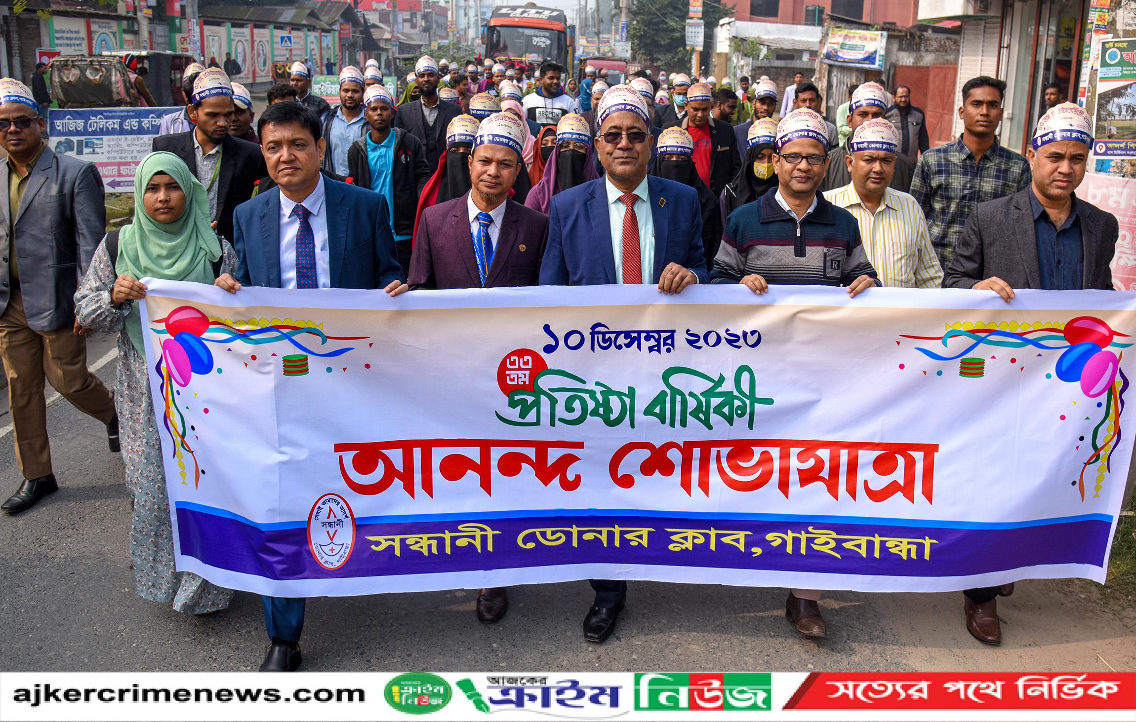 স্বেচ্ছায় রক্তদান কর্মসূচী ভিত্তিক সংগঠন গাইবান্ধা সন্ধানী ডোনার ক্লাবের ৩৩তম প্রতিষ্ঠাবার্ষিকী উপলক্ষে রোববার জেলা সদর হাসপাতাল চত্বরে বিভিন্ন কর্মসূচী পালন করা হয়। কর্মসূচীর মধ্যে ছিল জাতীয় ও সাংগঠনিক পতাকা উত্তোলন, বর্ণাঢ্য শোভাযাত্রা, আলোচনা সভা, সর্বোচ্চ স্বেচ্ছায় রক্তাদাতাদের সম্মাননা ও কেক কাটা।