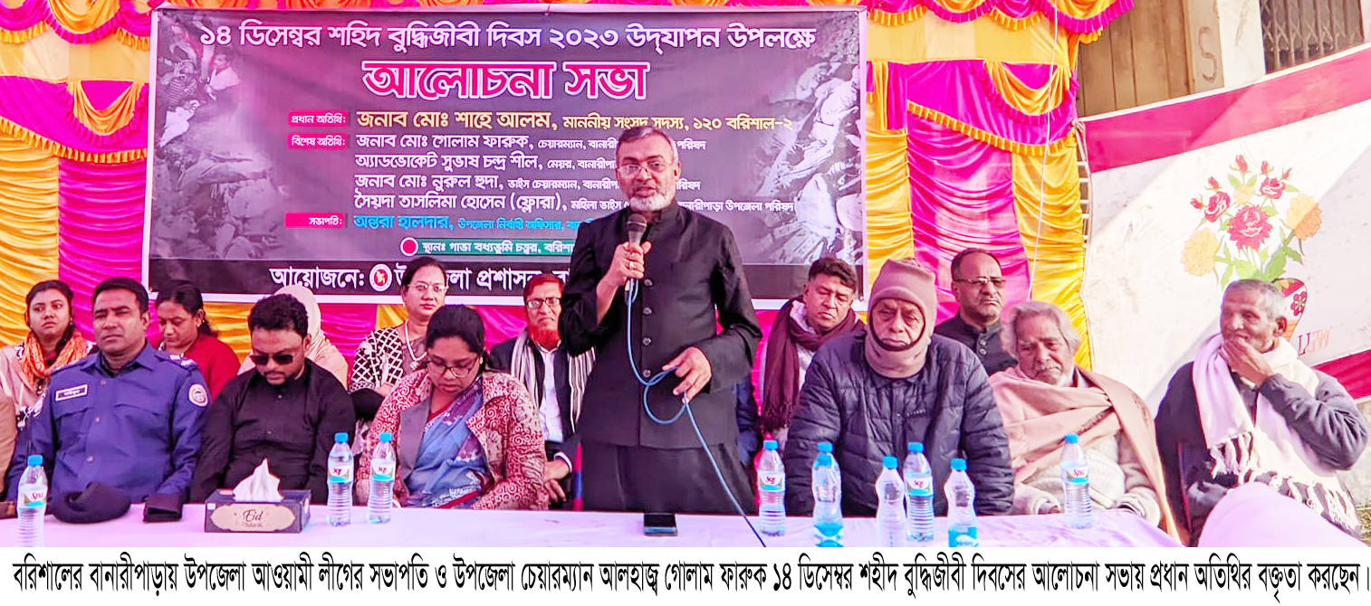 বরিশালের বানারীপাড়ায় বিনম্র শ্রদ্ধায় ১৪ ডিসেম্বর শহীদ বুদ্ধিজীবী দিবস পালিত হয়েছে। এ উপলক্ষে বৃহস্পতিবার (১৪ ডিসেম্বর) সকালে উপজেলার সদর ইউনিয়নের গাভা-নরেরকাঠি বধ্যভূমির স্মৃতি সৌধে উপজেলা প্রশাসন ও পরিষদ,মুক্তিযোদ্ধা সংসদ,আওয়মী লীগ এবং পৌরসভাসহ বিভিন্ন সংগঠনের পক্ষ থেকে পুষ্পার্ঘ অর্পণ ও শহীদদের স্মরণে এক মিনিট দাঁড়িয়ে নিরবতা পালণ করা হয়। পরে সেখানে উপজেলা প্রশাসন ও আওয়ামী লীগ এবং এর সহযোগী সংগঠনের উদ্যোগে পৃথক আলোচনা সভা অনুষ্ঠিত হয়। উপজেলা নির্বাহী অফিসার অন্তরা হালদারের সভাপতিত্বে অনুষ্ঠিত আলোচনা সভায় প্রধান অতিথি ছিলেন উপজেলা চেয়ারম্যান ও উপজেলা আওয়ামী লীগের সভাপতি আলহাজ¦ গোলাম ফারুক। বিশেষ অতিথি ছিলেন বানারীপাড়া পৌরসভার মেয়র অ্যাডভোকেট সুভাষ চন্দ্র শীল, উপজেলা সহকারি কমিশনার (ভূমি) আবুজর মোহাম্মদ ইজাজুল হক,বানারীপাড়া থানার ওসি মো. মাইনুল ইসলাম,উপজেলা আওয়ামী লীগের সাবেক সভাপতি বীর মুক্তিযোদ্ধা গোলাম সালেহ্ মঞ্জু মোল্লা,মুক্তিযুদ্ধকালীণ বেজ কমান্ডার বেনী লাল দাস গুপ্ত বেণূ,বীর মুক্তিযোদ্ধা মীর সাইদুর রহমান শাহজাহান প্রমুখ। পরে উপজেলা আওয়ামী লীগের সভাপতি আলহাজ¦ গোলাম ফারুকের সভাপতিত্বে আলোচনা সভায় আওয়ামী লীগ ও এর অঙ্গ সহযোগী সংগঠনের বিভিন্ন স্তরের নেতৃবৃন্দ বক্তৃতা করেন। ###