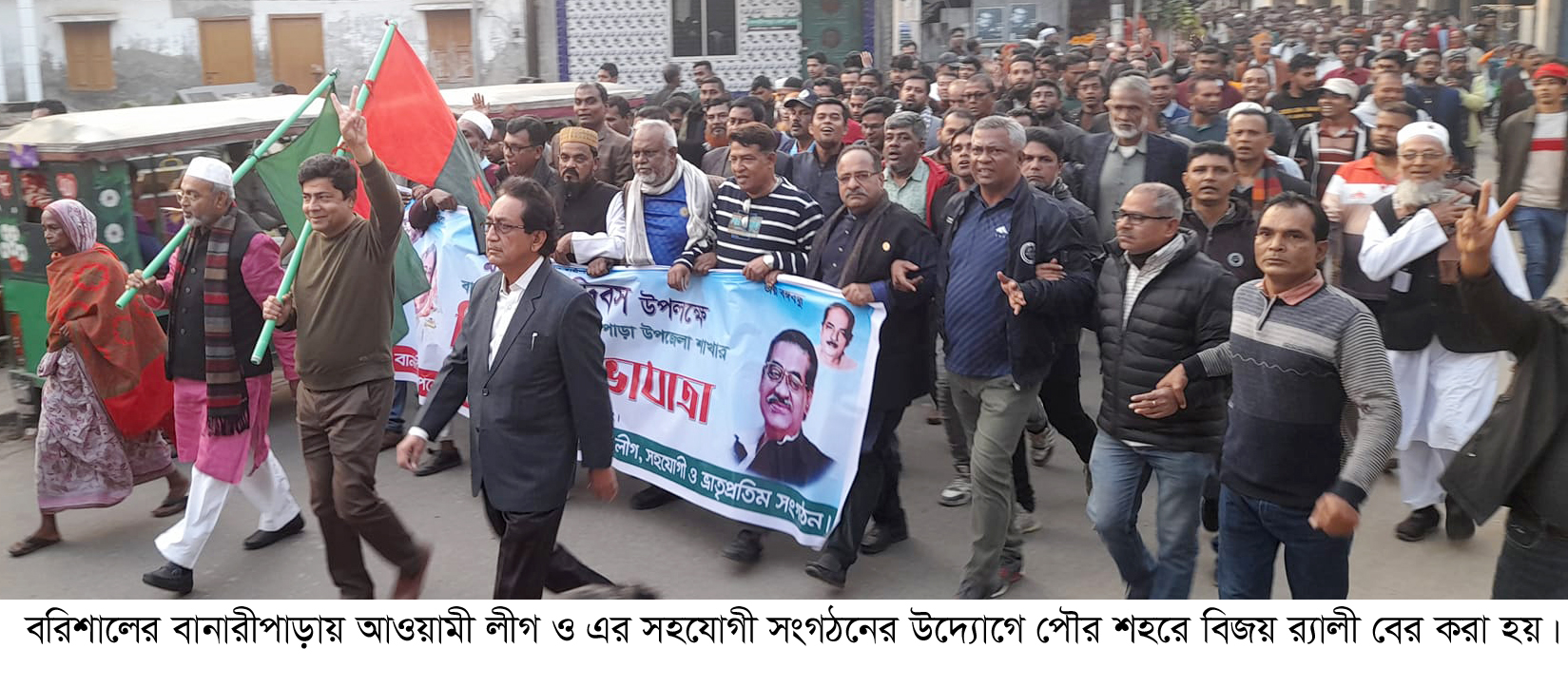 বরিশালের বানারীপাড়ায় ১৬ ডিসেম্বর মহান বিজয় দিবস উপলক্ষে কেন্দ্রীয় কর্মসূচির অংশ হিসেবে উপজেলা ও পৌর আওয়ামী লীগ এবং এর অঙ্গ সহযোগী সংগঠনের উদ্যোগে বর্ণাঢ্য বিজয় র্যালী অনুষ্ঠিত হয়েছে। ১৯ ডিসেম্বর মঙ্গলবার বিকালে ফেরীঘাট সংলগ্ন দলীয় কার্যালয়ের সামনে থেকে বানারীপাড়া উপজেলা আওয়ামী লীগের সভাপতি ও উপজেলা চেয়ারম্যান আলহাজ¦ গোলাম ফারুক এবং সাধারণ সম্পাদক অ্যাডভোকেট মাওলাদ হোসেন সানার নেতৃত্বে বিভিন্ন স্তরের কয়েক হাজার নেতা-কর্মীর অংশগ্রহণে বর্ণাঢ্য বিজয় র্যালিটি শুরু হয়ে পৌর শহরের প্রধান প্রধান সড়ক প্রদক্ষিণ শেষে পূনরায় দলীয় কার্যালয়ে গিয়ে শেষ হয়। এসময় অন্যান্যের মধ্যে উপস্থিত ছিলেন জেলা আওয়ামী লীগের আইন সম্পাদক ও বানারীপাড়া পৌর মেয়র অ্যাডভোকেট সুভাষ চন্দ্র শীল,উপজেলা আওয়ামী লীগের সাবেক সভাপতি ও সাবেক পৌর মেয়র বীর মুক্তিযোদ্ধা গোলাম সালেহ্ মঞ্জু মোল্লা,উপজেলা ওয়ার্কার্স পার্টির সভাপতি অধ্যাপক মন্টু লাল কুন্ডু,উপজেলা আওয়ামী লীগের সহ-সভাপতি আক্তার হোসেন মোল্লা,সহ-সভাপতি ও সদর ইউপি চেয়ারম্যান আ.জলিল ঘরামী,সহ-সভাপতি ও চাখারের ইউপি চেয়ারম্যান সৈয়দ মজিবুল ইসলাম টুকু,সহ-সভাপতি মাষ্টার আ.সালাম,সাংগঠনিক সম্পাদক ও জেলা পরিষদ সদস্য মামুন-উর রশিদ স্বপন,সাংগঠনিক সম্পাদক জাকির হোসেন সরদার,দপ্তর সম্পাদক অধ্যাপক এমাম হোসেন,কৃষি ও সমবায় বিষয়ক সম্পাদক সাবেক ইউপি চেয়ারম্যান আবুল কালাম আজাদ,স্বাস্থ্য ও জনসংখ্যা বিষয়ক সম্পাদক ওসমান গণি,সাবেক কোষাধ্যক্ষ ফারুক হোসেন সরদার,সদস্য ফারুক বেপারী,জুয়েল ফকির,রিয়াজুল ইসলাম রাজু,সৈয়দকাঠি ইউপি চেয়ারম্যান বীর মুক্তিযোদ্ধা আনোয়ার হোসেন মৃধা,সাবেক চেয়ারম্যান আ.মন্নান মৃধা,পৌর আওয়মী লীগের সভাপতি কামাল হোসেন মোল্লা,সাধারণ সম্পাদক শেখ শহিদুল ইসলাম,ইলুহার ইউপির সাবেক চেয়ারম্যান এসএম কালাম,উপজেলা শ্রমিকলীগের সভাপতি শাহজাহান হাওলাদার,সাধারণ সম্পাদক মীর সুলতান হোসেন,সম্মেলন প্রস্তুটি কমিটির সদস্য সচিব আবুল কালাম,স্বেচ্ছাসেবকলীগের সাধারণ সম্পাদক সুলতান হোসেন সিকদার,শেখ রাসেল জাতীয় শিশু কিশোর পরিষদের সভাপতি আবুল বাশার বাদশা,সাধারণ সম্পাদক এনায়েত হোসেন মোল্লা,সাবেক কাউন্সিলর রফিকুল আলম,মশিউর রহমান কামাল ও আনোয়ার হোসেন,উপজেলা যুবলীগ নেতা মু.মুন্তাকিম লস্কর কায়েস,মাসুম বিল্লাহ্,উপজেলা ছাত্রলীগের সভাপতি সুমন মোল্লা,পৌর মহিলা আওয়ামী লীগের সাধারণ সম্পাদক লিমা আক্তার,পৌর স্বেচ্ছাসেবক লীগের সভাপতি শফিক শাহিন,সম্পাদক ফয়েজ আহম্মেদ শাওন প্রমুখ। ###