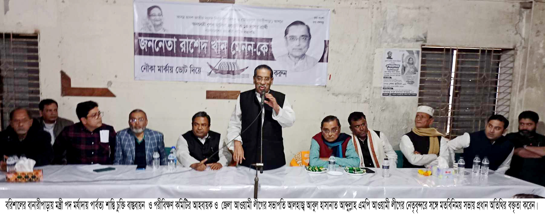 রাহাদ সুমন,বিশেষ প্রতিনিধি॥ মন্ত্রী পদ মর্যাদায় পার্বত্য শান্তি চুক্তি বাস্তবায়ন ও পরীবিক্ষণ কমিটির আহবায়ক এবং বরিশাল জেলা আওয়ামী লীগের সভাপতি বীর মুক্তিযোদ্ধা আলহাজ¦ আবুল হাসানাত আব্দুল্লাহ্ এমপি বলেছেন,যারা নির্বাচিত রাষ্ট্রপতি জাতির পিতা বঙ্গবন্ধু শেখ মুজিবুর রহমানকে সপরিবারে নির্মমভাবে হত্যা করে উর্দি পড়ে বন্দুকের নলের মুখে ক্ষমতা দখলের পর হত্যার বিচার রুখে দিতে ইনডেমেনিটি আইন করতে পারে তাদের মুখে গণতন্ত্র ও মানবাধিকারের কথা মানায় না। ১ জানুয়ারী সোমবার বিকালে আসন্ন্ সংসদ নির্বাচন উপলক্ষ্যে বরিশাল-২ আসনে নৌকার সমর্থনে বানারীপাড়া ও উজিরপুর উপজেলা আওয়ামী লীগের নেতৃবৃ›ন্দের সঙ্গে যৌথ মতবিনিময় সভায় প্রধান অতিথির বক্তৃতায় তিনি এসব কথা বলেন। এসময় তিনি আরও বলেন, বঙ্গবন্ধু কন্যা জননেত্রী শেখ হাসিনার নেতৃত্বে চলমাণ উন্নয়নের ধারা অব্যাহত রাখতে ও দেশী-বিদেশী ষড়যন্ত্র রুখে দিতে আওয়ামী লীগের নেতা-কর্মীদের ঐক্যবদ্ধ হয়ে নৌকার বিজয় নিশ্চিত করতে হবে। বানারীপাড়ায় দলীয় কার্যালয়ে উপজেলা আওয়ামী লীগের সভাপতি ও উপজেলা চেয়ারম্যান আলহাজ¦ গোলাম ফারুকের সভাপতিত্বে অনুষ্ঠিত এ মতবিনিময় সভায় বিশেষ অতিথির বক্তৃতায় বরিশাল-২ (বানারীপাড়া-উজিরপুর) আসনে ১৪ দলীয় জোটের প্রার্থী বাংলাদেশ ওয়ার্কার্স পার্টির সভাপতি আলহাজ¦ রাশেদ খান মেনন বলেন,কুটিল ষড়যন্ত্রের মধ্যে জটিল এ নির্বাচনের চ্যালেঞ্জ মোকাবেলায় আওয়ামী লীগের নেতৃত্বে মুক্তিযুদ্ধের সপক্ষের সবাইকে ঐক্যবদ্ধ হয়ে নির্বাচনে ভোট উৎসবের মধ্য দিয়ে এর জবাব দিতে হবে। আওয়ামী লীগ নেতা কর্মীদের উদ্দেশ্যে তিনি আরও বলেন, আগে নিজেকে বিজয়ী করতে হবে কারন নিজে বিজয়ী হলে নৌকা বিজয়ী হবে এবং শেখ হাসিনা বিজয়ী হবেন। সভায় বিশেষ অতিথির বক্তৃতা করেন জেলা আওয়ামী লীগের সাধারণ সম্পাদক ও সাবেক সংসদ সদস্য বীর মুক্তিযোদ্ধা অ্যাডভোকেট তালুকদার মো. ইউনুস,আওয়ামী লীগের কেন্দ্রীয় কার্যনির্বাহী সদস্য আনিসুর রহমান,বরিশালের সংরক্ষিত সংসদ সদস্য অ্যাডভোকেট সৈয়দা রুবিনা আক্তার মিরা প্রমুখ। বানারীপাড়া উপজেলা আওয়ামী লীগের সাধারণ সম্পাদক অ্যাডভোকেট মাওলাদ হোসেন সানার সঞ্চালনায় এছাড়াও বক্তৃতা করেন জেলা আওয়ামী লীগের আইন বিষয়ক সম্পাদক ও বানারীপাড়া পৌর মেয়র অ্যাডভোকেট সুভাষ চন্দ্র শীল, জেলা আওয়ামী লীগের উপ-দপ্তর সম্পাদক অ্যাডভোকেট কাইয়ুম খান কায়সার,উজিরপুর উপজেলা আওয়ামী লীগের সহ-সভাপতি ও সাবেক উপজেলা চেয়ারম্যান এইচ এম হাফিজুর রহমান ইকবাল,বানারীপাড়া উপজেলা আওয়ামী লীগের সহ-সভাপতি ও চাখার ইউপির সাবেক চেয়ারম্যান খিজির সরদার,সহ-সভাপতি ও সলিয়াবাকপুর ইউপি চেয়ার