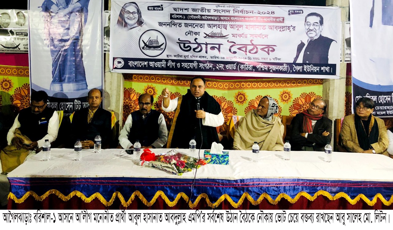 আওয়ামী লীগ মনোনীত প্রাথী জাতির পিতার ভাগনে, কেন্দ্রীয় আওয়ামী লীগের সিনিয়র সদস্য, বরিশাল জেলা আওয়ামী লীগের সভাপতি, বরিশাল-১ আসনে আওয়ামী লীগ মনোনীত প্রার্থী আলহাজ্ব আবুল হাসানাত আবদুল্লাহ এমপি’র নৌকা মার্কার সমর্থনে দ্বাদশ সংসদ নির্বাচনের প্রচার-প্রচারনার শেষ সময়ে বিভিন্ন স্থানে সর্বশেষ উঠান বৈঠক অনুষ্ঠিত হয়েছে। বৃহস্পতিবার রাতে গৈলা ইউনিয়নের ২নং ওয়ার্ড পশ্চিম সুজনকাঠী ও কাঠিরা গ্রামের ভোটারদের নিয়ে উপজেলা কৃষক লীগের সাধারণ সম্পাদক রমনী কান্ত সরকার এর সভাপতিত্বে উঠান বৈঠক অনুষ্ঠিত হয়েছে।