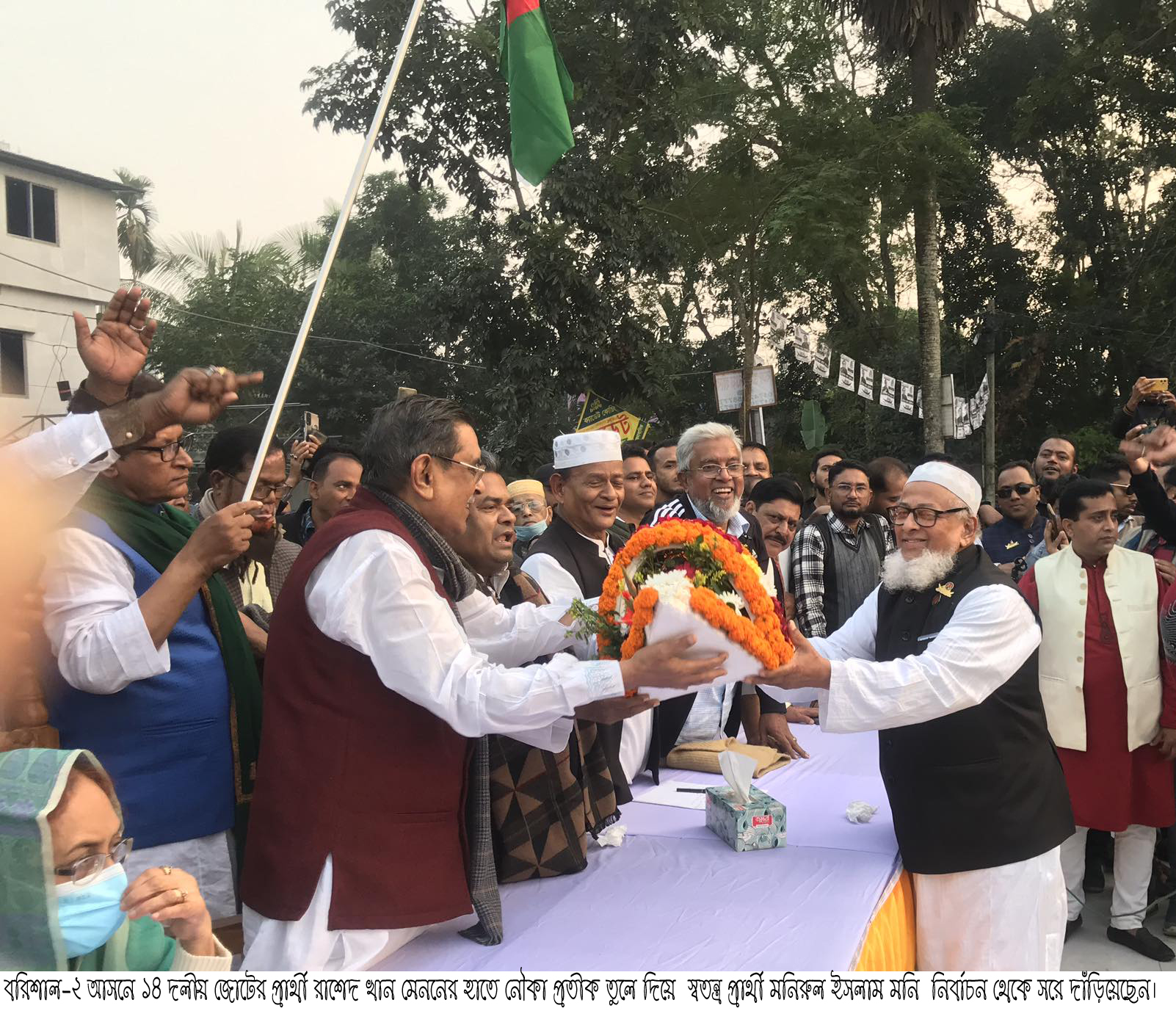 রাহাদ সুমন,বিশেষ প্রতিনিধি॥ দ্বাদশ জাতীয় সংসদ নির্বাচনে বরিশাল-২ (বানারীপাড়া-উজিরপুর) আসনে ১৪ দলীয় জোটের নৌকা প্রতীকের প্রার্থী বাংলাদেশ ওয়ার্কার্স পার্টির সভাপতি রাশেদ খান মেননকে সমর্থন দিয়ে ঢেঁকি প্রতীকের স্বতন্ত্র প্রার্থী তিন বারের সাবেক সংসদ সদস্য ও আওয়ামী লীগ নেতা বীর মুক্তিযোদ্ধা মো. মনিরুল ইসলাম মনি নির্বাচন থেকে সরে দাঁড়িয়েছেন। বৃহস্পতিবার (৪ জানুয়ারী) বিকালে উজিরপুর হাই স্কুল মাঠে নৌকার সমর্থনে কয়েক হাজার নেতা-কর্মী ও সমর্থকের গণমিছিলোত্তর ঊঠান বৈঠকে তিনি যোগদান করে মেননের হাতে ফুলের নৌকা প্রতীক তুলে দিয়ে তার প্রতি সমর্থন জানিয়ে আনুষ্ঠানিকভাবে নির্বাচন থেকে সরে দাঁড়ানোর ঘোষণা দেন। এসময় মনিরুল ইসলাম মনি বলেন,আওয়ামী লীগ সভাপতি বঙ্গবন্ধু কন্যা দেশরত্ন শেখ হাসিনা ও বঙ্গবন্ধুর ভাগ্নে জেলা আওয়ামী লীগের সভাপতি আলহাজ¦ আবুল হাসানাত আব্দুল্লাহর প্রতি শ্রদ্ধা জানিয়ে দেশ ও দলের বৃহত্তর স্বার্থে তিনি নৌকার প্রার্থীকে সমর্থন জানিয়েছেন। তিনি এসময় বিএনপি-জামায়াতের অগ্নি সন্ত্রাস ও দেশী-বিদেশী সকল ষড়যন্ত্র-চক্রান্ত ঐক্যবদ্ধভাবে রুখে দিয়ে ৭ জানুয়ারী বিপুল ভোটে উন্নয়ন-অগ্রযাত্রার প্রতীক নৌকাকে বিজয়ী করতে আওয়ামী লীগের সর্বস্তরের নেতা-কর্মীসহ উজিরপুর-বানারীপাড়াবাসীর প্রতি উদাত্ত আহবান জানান। উজিরপুর উপজেলা আওয়ামী লীগের সভাপতি এসএম জামাল হোসেনের সভাপতিত্বে অনুষ্ঠিত উঠান বৈঠকে প্রধান অতিথি ছিলেন ১৪ দলীয় জোট প্রার্থী ওয়ার্কার্স পার্টির সভাপতি রাশেদ খান মেনন। বিশেষ অতিথি ছিলেন জেলা আওয়ামী লীগের সাধারণ সম্পাদক ও সাবেক সংসদ সদস্য অ্যাডভোকেট তালুকদার মো. ইউনুস । এছাড়াও বক্তৃতা করেন উজিরপুর উপজেলা আওয়ামী লীগের সহ-সভাপতি ও উপজেলা চেয়ারম্যান আ.মজিদ সিকদার বাচ্চু,সহ-সভাপতি ও সাবেক উপজেলা চেয়ারম্যান এইচএম হাফিজুর রহমান ইকবাল,সাধারণ সম্পাদক ও পৌর মেয়র গিয়াসউদ্দিন বেপারী,স্বেচ্ছাসেবক লীগের কেন্দ্রীয় সাংগঠনিক সম্পাদক আবিদ আল হাসান প্রমুখ। এদিকে তিন বারের সাবেক সংসদ সদস্য ও বানারীপাড়া-উজিরপুরের উন্নয়নের রূপকার বীর মুক্তিযোদ্ধা আলহাজ¦ মো. মনিরুল ইসলাম মনি শেষ মুহুর্তে নির্বাচন থেকে সরে দাঁড়িয়ে নৌকার প্রার্থী ৫ বারের সংসদ সদস্য মুক্তিযুদ্ধের সংগঠক ও সাবেক মন্ত্রী আলহাজ¦ রাশেদ খান মেননকে সমর্থন দেওয়ায় বরিশাল-২ আসনের নির্বাচনী রাজনীতিতে নয়া মেরুকরণের সৃষ্টি হয়েছে। এ আসনে এখন মোট ৫ জন প্রার্থী নির্বাচনী মাঠে লড়াইয়ে রয়েছেন। তারা হলেন, নৌকার প্রার্থী রাশেদ খান মেনন,স্বতন্ত্র প্রার্থী ঈগল প্রতীকের একে ফাইয়াজুল হক রাজু,কৃষক শ্রমিক জনতা লীগের গামছা প্রতীকের প্রার্থী সঙ্গীত শি