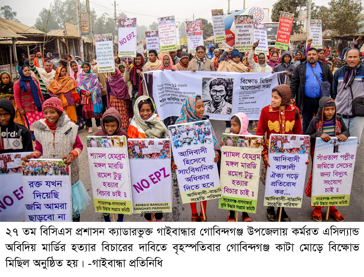 ২৭ তম বিসিএস প্রশাসন ক্যাডারভুক্ত গাইবান্ধার গোবিন্দগঞ্জ উপজেলায় কর্মরত এসিল্যান্ড অবিদিয় মার্ডির হত্যার বিচারের দাবিতে বৃহস্পতিবার গোবিন্দগঞ্জের কাটা মোড়ে বিক্ষোভ মিছিল ও মানববন্ধন কর্মসূচি পালন করা হয়। শহীদ অবিদিয় মার্ডি পরিষদ, সাহেবগঞ্জ বাগদাফার্ম ভুমি উদ্ধার সংগ্রাম কমিটি ও আদিবাসী বাঙালি সংহতি পরিষদ এই বিক্ষোভ মিছিল ও মানববন্ধন কর্মসূচির আয়োজন করে।