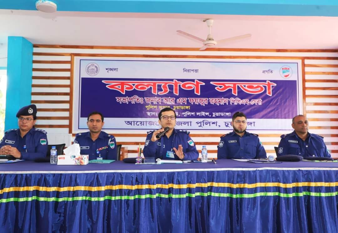 পুলিশ পরিদর্শক(নিঃ), সাইফুল ইসলাম প্রমুখ। পুলিশ সুপার কল্যাণ সভায় অংশগ্রহণকারী সকল অফিসার ও ফোর্সদের কথা পর্যায়ক্রমে মনোযোগ সহকারে শোনেন।এছাড়া পূর্ববর্তী কল্যাণ সভায় উপস্থাপিত বিষয়ে সমাধানসহ সার্বিক বিষয়ে আলোচনা করেন।তিনি চাহিদার প্রেক্ষিতে থানা,ক্যাম্প ও ফাঁড়িতে দাপ্তরিক ব্যবহার্য জিনিস-পত্রাদি প্রদান করেন। পরে বিভিন্ন ক্যাটাগরিতে শ্রেষ্ঠত্ব অর্জন করায় এবং দাপ্তরিক কাজ সুষ্ঠুভাবে সম্পন্ন করায় ভাল কাজের স্বীকৃতি স্বরূপ শ্রেষ্ঠ অফিসার ইনচার্জ, এসএম জাবীদ হাসান, জীবননগর থানা; শ্রেষ্ঠ এসআই (নিঃ)/ মোঃ রফিকুল ইসলাম, জেলা গোয়েন্দা শাখা; শ্রেষ্ঠ এএসআই (নিঃ)/ মোঃ আশরাফুজ্জামান, চুয়াডাঙ্গা থানা; শ্রেষ্ঠ এসআই(নিঃ) (থানা/ফাঁড়ি/ ক্যাম্প পর্যায়ে) এসআই(নিঃ)/ মোঃ দিদারুল ইসলাম, হাসাদাহ পুলিশ ক্যাম্প, জীবননগর থানা; শ্রেষ্ঠ এএসআই(নিঃ) (থানা/ফাঁড়ি/ ক্যাম্প পর্যায়ে) এএসআই(নিঃ)/ মোঃ সাইদুর রহমান, কার্পাসডাঙ্গা পুলিশ ক্যাম্প, দামুড়হুদা থানা; বিশেষ পারফরমেন্স (সর্বোচ্চ সাজা ওয়ারেন্ট তামিল) এএসআই(নিঃ)/ মোঃ রেয়াজুল ইসলাম, আলমডাঙ্গা থানা, চুয়াডাঙ্গাসহ সর্বমোট ৩২ জনকে পুলিশ সুপার ক্রেস্ট, সার্টিফিকেট ও নগদ অর্থ পুরস্কার প্রদান করেন।মাসিক কল্যাণ সভায় পুলিশ সুপার মহ