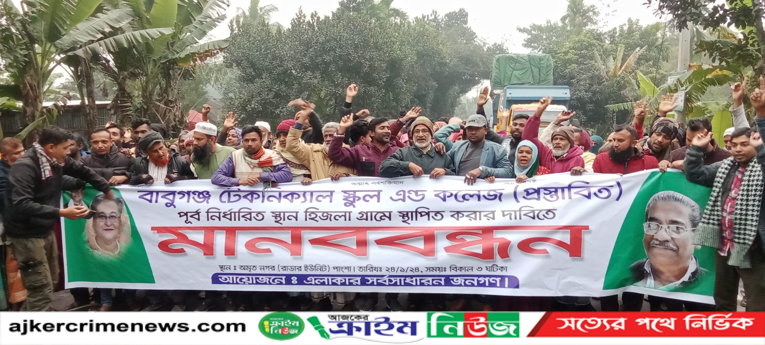বাবুগঞ্জ (বরিশাল) প্রতিনিধিঃ বরিশালের বাবুগঞ্জে বাবুগঞ্জ টেকনিক্যাল স্কুল এন্ড কলেজ (প্রস্তাবিত) পূর্ব নির্ধারিত স্থানে স্থাপন করার দাবিতে বিক্ষোভ মিছিল ও মানববন্ধন করেছেন এলাকাবাসী।
