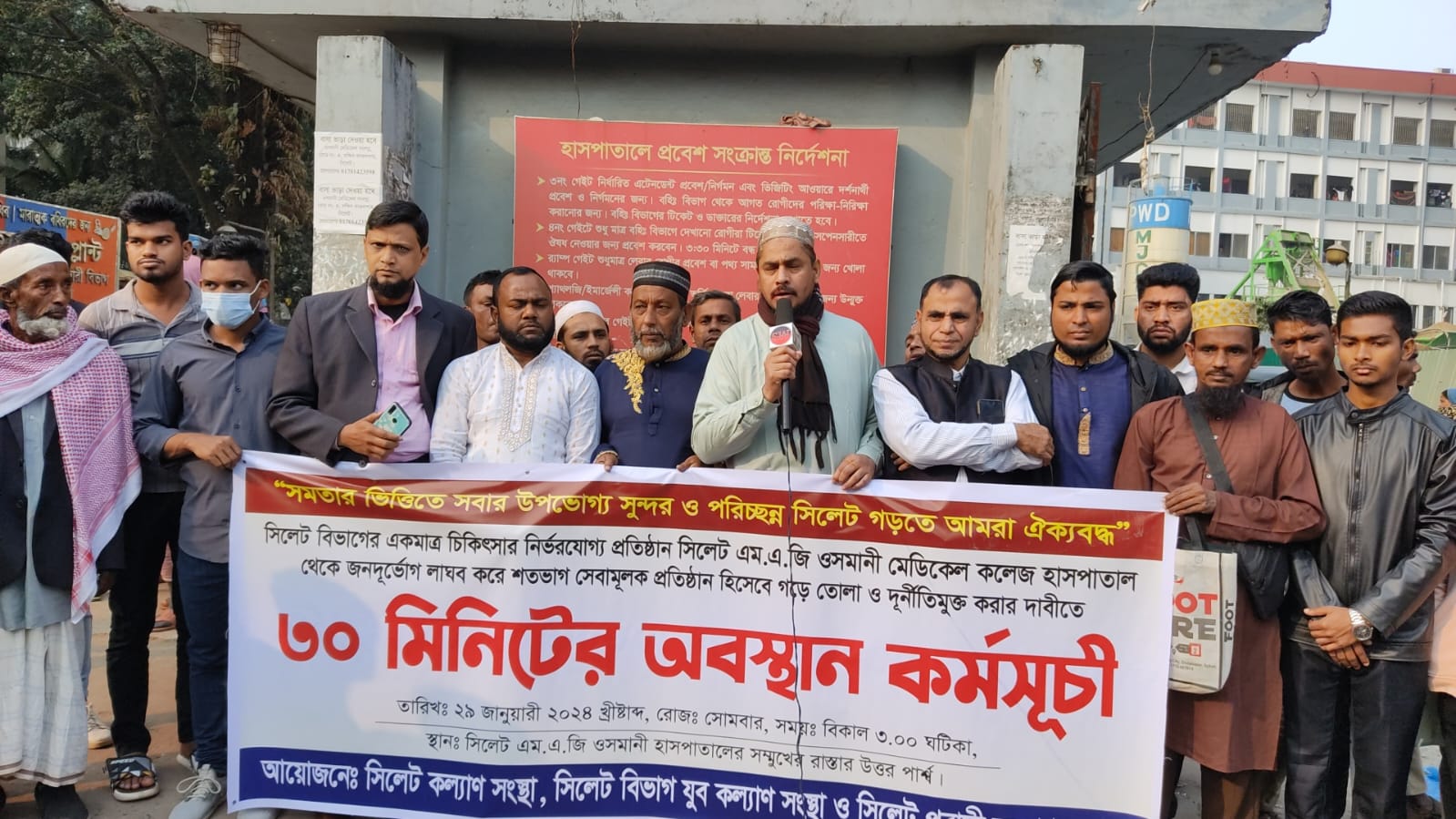 আবুল কাশেম রুমন,সিলেট : বৃহত্তর সিলেটের অরাজনৈতিক কল্যাণমূলক স্বেচ্ছাসবী সামাজিক সংগঠন সিলেট কল্যাণ সংস্থা (সিকস), সিকস’র অঙ্গ সংগঠন সিলেট বিভাগ যুব কল্যাণ সংস্থা (সিবিযুকস) ও বাংলাদেশী প্রবাসীদের সবধরনের দাবি উপস্থাপনের বলিষ্ঠ সংগঠন সিলেট প্রবাসী কল্যাণ সংস্থা (সিপ্রকস) এর যৌথ উদ্যোগে সোমবার (২৯ জানুয়ারী ২০২৪) বিকাল ৩.০০ ঘটিকায় সিলেট এম.এ.জি ওসমানী মেডিকেল কলেজ হাসপাতালের সম্মুখের রাস্তার উত্তর পার্শ্বে সিলেট বিভাগের একমাত্র চিকিৎসার সর্ববৃহৎ নির্ভয়যোগ্য প্রতিষ্ঠান সিলেট এম.এ.জি ওসমানী মেডিকেল কলেজ হাসপাতাল থেকে জনদূর্ভোগ লাঘব করে শত ভাগ সেবামূলক হিসেবে গড়ে তোলা ও দুর্নীতিমুক্ত করার দাবীতে ৩০ মিনিটের অবস্থান কর্মসূচী অনুষ্ঠিত হয়।