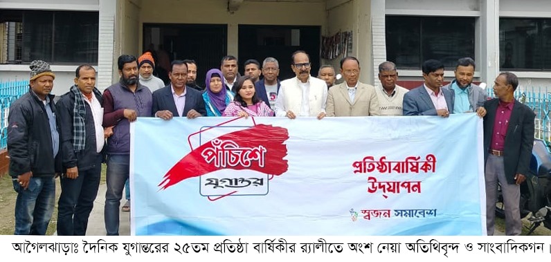 বরিশালের আগৈলঝাড়ায় দৈনিক যুগান্তরের ২৫তম প্রতিষ্ঠা বার্ষিকী উপলক্ষে র্যালী, কেক কাটা ও আলোচনাসভা অনুষ্ঠিত হয়েছে। এ উপলক্ষে ১ফেব্রুয়ারী বৃহস্পতিবার সকালে উপজেলা পরিষদ চত্তরে র্যালী শেষে উপজেলা পরিষদ হল রুমে প্রেসক্লাব প্রতিষ্ঠাতা সভাপতি ও প্রেসক্লাবের আহ্বায়ক সরদার হারুন রানার সভাপতিত্বে পবিত্র কুরআন থেকে তেলায়ত করেন বাংলাদেশের আলো ও দৈনিক হিরন্ময় পত্রিকার প্রতিনিধি বি এম মনির হোসেন,পবিত্র গিতা পাঠ করেন প্রবীর বিশ্বাস ননি, স্বাগত বক্তব্য রাখেন যুগান্তরের আগৈলঝাড়া প্রতিনিধি সাইফুল ইসলাম রব। প্রেসক্লাবের সাবেক সাধারণ সম্পাদক শামীমুল ইসলাম শামীমের সঞ্চালনায় আলোচনা সভায় বস্তুনিষ্ঠ সংবাদ পরিবেশনের আহ্বান জানিয়ে প্রধান অতিথির বক্তব্য রাখেন উপজেলা পরিষদ চেয়ারম্যান বীর মুক্তিযোদ্ধা আব্দুর রইচ সেরনিয়াবাত। বিশেষ অতিথি হিসেবে বক্তব্য রাখেন সহকারী কমিশনার (ভূমি) উম্মে ইমামা বানিন, উপজেলা স্বাস্থ্য ও পরিবার পরিকল্পনা কর্মকর্তা ডাঃ বখতিয়ার আল মামুন, উপজেলা আওয়ামী লীগ সভাপতি সুনীল কুমার বাড়ৈ,সাধারণ সম্পাদক আবু সালেহ মোঃ লিটন সেরনিয়াবাত। অন্যান্যদের মধ্যে আরও বক্তব্য রাখেন প্রেসক্লাবের সাবেক সভাপতি কে এম আজাদ রহমান, সাবেক সাধারণ সম্পাদক তপন বসু, সাবেক যুগ্ম সম্পাদক ওমর আলী সানি, আগৈলঝাড়া রিপোর্টার্স ইউনিটির সভাপতি মোল্লা আসাদুজ্জামান সবুজ, সাংবাদিক শাকিব খান, এনজিও সমন্বয় পরিষদের সাধারণ সম্পাদক কাজল দাসগুপ্ত। প্রতিষ্ঠা বার্ষিকীর অনুষ্ঠানে সরকারী কর্মকর্তা ও সাংবাদিক গন উপস্থিত ছিলেন।