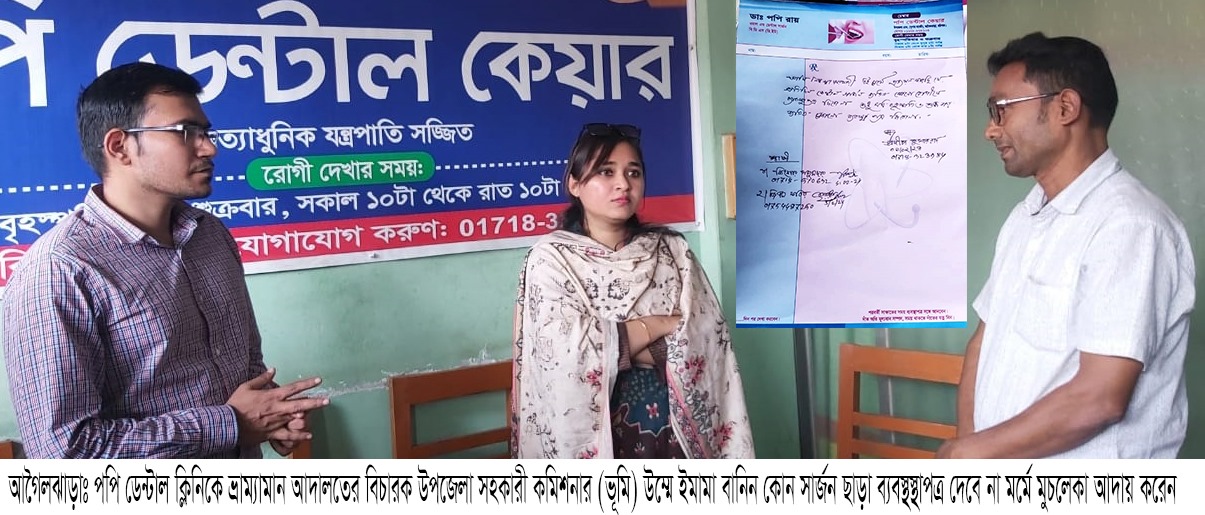 একই মার্কেটে অবস্থিত পপি ডেন্টাল ক্লিনিকের মালিক ডেন্টাল চিকিৎসক প্রদীপ কুমার রায় কোন চিকিৎসক না হওয়ায় তাকে রোগী দেখতে নিষেধ করেন আদালত। পরে “ডেন্টাল সার্জন ব্যাতীত কোন রোগীকে ব্যবস্থাপত্র দেবে না” মর্মে মুচলেকা আদায় করে ভ্রাম্যমান আদালতের বিচারক। ভ্রাম্যমান আদালত পরিচালনার সময় উপজেলা স্বাস্থ্য কমপ্লেক্সের আবাসিক মেডিকেল অফিসার ডাঃ অর্ণব সাহা, এস আই মোঃ নূরে আলম, আদালতের নাজির সোহেল আমিন উপস্থিত ছিলেন। সূত্র মতে, উপজেলা স্বাস্থ্য কমপ্লেক্স এর তালিকা অনুযায়ি উপজেলা স্বাস্থ্য কমপ্লেক্সের সামনে, উপজেলা সদরসহ বিভিন্ন এলাকায় ১২টি বেসরকারী অবৈধ হাসপাতাল, ক্লিনিক ও ডায়াগনিস্টিক সেন্টার রয়েছে। এরা বছরের পর বছর রোগীদের সাথে সেবার নামে প্রতারণা করে অবৈধভাবে স্বাস্থ্য সেবার ব্যবসা করে আসছে। অভিযানের সময়ে “প্রয়োজনীয় কাগজপত্র করবেন” বলে ভ্রাম্যমান আদালতসহ স্বাস্থ্য অধিদপ্তরের কাছে বারবার বলে আসলেও বৈধ কোন কাগজপত্র তারা না করেই ব্যবসা পরিচালনা করে আসছে। স্বাস্থ্যসেবা প্রদানকারী ওই সকল অবৈধ প্রতিষ্ঠানের বিরুদ্ধে আইনগত ব্যবস্থা নেয়ার জোর দাবি জানিয়েছেন স্থানীয়রা।