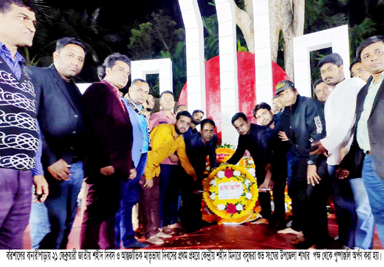 বরিশালের বানারীপাড়ায় ২১ ফেব্রুয়ারী জাতীয় শহীদ দিবস ও আন্তর্জাতিক মাতৃভাষা দিবসের প্রথম প্রহরে কেন্দ্রীয় শহীদ মিনারে বসুন্ধরা শুভসংঘের উপজেলা শাখার পক্ষ থেকে পুষ্পার্ঘ অর্পণ করা হয়েছে। এসময় অন্যান্যের মধ্যে উপস্থিত ছিলেন বসুন্ধরা শুভসংঘের উপজেলা শাখার উপদেষ্টা ও বানারীপাড়া প্রেসক্লাব সভাপতি রাহাদ সুমন,বসুন্ধরা শুভসংঘের উপজেলা শাখার সভাপতি জাহিদ হোসেন,সাধারণ সম্পাদক ফয়েজ আহম্মেদ শাওন,সহ-সভাপতি নৃপেন সমদ্দার,সুমন দেবনাথ ও রাজিব চেকদার,সাংগঠনিক সম্পাদক মো.হাসানাত হোসেন,প্রচার ও প্রকাশনা সম্পাদক মো. রায়হান,সমাজকল্যাণ সম্পাদক মো. সাইফুল ইসলাম,সহ-প্রচার সম্পাদক মেহেদী হাসান,কার্যনির্বাহী সদস্য কেএম শফিকুল আলম জুয়েল,বিমল ঘরামী,সহকারি অধ্যাপক মামুন আহম্মেদ, অঞ্জন প্রসাদ সরকার,নাসির উদ্দিন,রেজাউল ইসলাম বেল্লাল,স্বপন মাঝি, মো. জাকারিয়া,সম্পদ সরকার,মিরাজ হোসেন প্রমুখ। ###