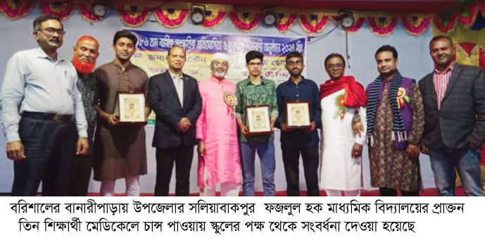 প্রাক্তন তিন শিক্ষার্থী মেডিকেলে চান্স পাওয়ায় স্কুলের পক্ষ থেকে সংবর্ধনা দেওয়া হয়েছে। সোমবার ( ৪ মার্চ) রাতে বিদ্যালয়ের বার্ষিক ক্রীড়া ও সাংস্কৃতিক প্রতিযোগিতা এবং পুরস্কার বিতরণী অনুষ্ঠানে বিদ্যালয়ের প্রাক্তন তিন ছাত্র মোঃ নবীউল হাসান খান ফরিদপুর বঙ্গবন্ধু শেখ মুজিবুর মেডিকেল কলেজে ও আবিদ হোসেন এবং আশিষ সোমদ্দার বরিশাল শেরে বাংলা মেডিকেল কলেজে চান্স পাওয়ায় তাদের এ সংবর্ধনা দেওয়া হয়। এসময় সংবর্ধিত কৃতি এ শিক্ষার্থীদের সম্মাননা ক্রেষ্ট ও ফুলেল শুভেচ্ছায় সিক্ত করা হয়। বিদ্যালয় প্রাঙ্গনে ম্যানেজিং কমিটির সভাপতি রফিকুল ইসলাম মানিকের সভাপতিত্বে অনুষ্ঠানে প্রধান অতিথি ছিলেন বিদ্যালয়ের সাবেক সভাপতি ও বিশিষ্ট ব্যবসায়ী ক্যাপ্টেন এম মোয়াজ্জেম হোসেন। অনুষ্ঠানে বিশেষ অতিথি ছিলেন বানারীপাড়া উপজেলা পরিষদের চেয়ারম্যান ও উপজেলা আওয়ামী লীগের সভাপতি আলহাজ্ব গোলাম ফারুক, সহ-সভাপতি আক্তার হোসেন মোল্লা,সাংগঠনিক সম্পাদক জাকির হোসেন সরদার, বানারীপাড়া প্রেসক্লাব সভাপতি রাহাদ সুমন, যুবলীগ নেতা মু. মুন্তাকিম লস্কর কায়েস, প্রেসক্লাবের যুগ্ম সম্পাদক ফয়েজ আহম্মেদ শাওন প্রমুখ।