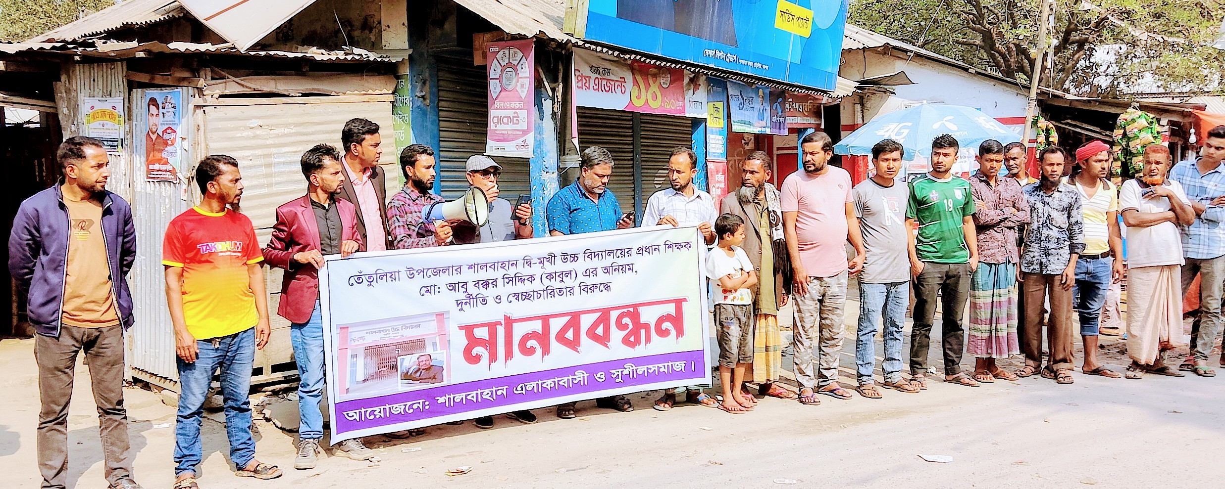 বুধবার বিকেলে উপজেলার শালবাহান বাজারের আঞ্চলিক সড়কে ঘন্টাব্যাপী এ মানববন্ধন ও বিক্ষোভ কর্মসুচী পালন করেন। এ সময় মানববন্ধন ও বিক্ষোভে বক্তারা প্রধান শিক্ষকের বিরুদ্ধে অবৈধভাবে পত্রিকায় বিজ্ঞপ্তি দিয়ে শিক্ষক নিয়োগ দেয়ার অভিযোগ সহ নানা অপকর্ম সকলের সামনে তুলে ধরেন এবং প্রধান শিক্ষককে অপসারণের দাবিতে জানান তারা।
