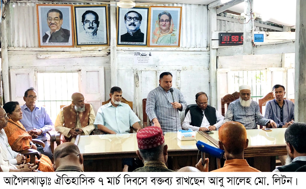 যথাযোগ্য মর্যাদায় বিভিন্ন কর্মসূচীর মধ্য দিয়ে বরিশালের আগৈলঝাড়ায় উপজেলা আওয়ামী লীগ ও সকল সহযোগী সংগঠনের উদ্যোগে জাতির পিতার ঐতিহাসিক ৭ মার্চ ভাষণ দিবস পালিত হয়েছে। দিবসটি পালন উপলক্ষে ৭ মার্চ বৃহস্পতিবার সকালে উপজেলা আওয়ামী লীগ কার্যালয়ের সামনে জাতির পিতা বঙ্গবন্ধু শেখ মুজিবুর রহমানের প্রতিকৃতিতে শ্রদ্ধা নিবেদন শেষে বর্নাঢ্য র্যালী শহরের প্রধান প্রধান সড়ক ঘুরে পুণরায় দলীয় কার্যালয়ে শেষ হয়। দলীয় কার্যালয়ে উপজেলা আওয়ামী লীগ সভাপতি সুনীল কুমার বাড়ৈর সভাপতিত্বে দিবসের তাৎপর্য তুলে ধরে ঐতিহাসিক ৭ মার্চের ভাষণের পটভুমির উপর বক্তব্য রাখেন আগৈলঝাড়া উপজেলা আওয়ামী লীগের সাধারণ সম্পাদক আবু সালেহ মোঃ লিটন সেরনিয়াবাত।অন্যান্যদের মধ্যে আরও বক্তব্য রাখেন উপজেলা আওয়ামী লীগের প্রচার ও প্রকাশনা সম্পাদক ফরহাদ হোসেন তালুকদার, বাগধা উইনিয়ন আওয়ামী লীগের সাধারণ সম্পাদক বজলুর রহমান হাওলাদার, উপজেলা স্বেচ্ছাসেবক লীগের সভাপতি ফিরোজ সিকদার, যুবলীগের সহ-সভাপতি আবদুল্লাহ লিটন। অনুষ্ঠানে উপজেলা আওয়ামী লীগের নেতৃবৃন্দ ছাড়াও সহযোগী সংগঠনের নেতৃবৃন্দ, জনপ্রতিনিধিরা উপস্থিত ছিলেন।