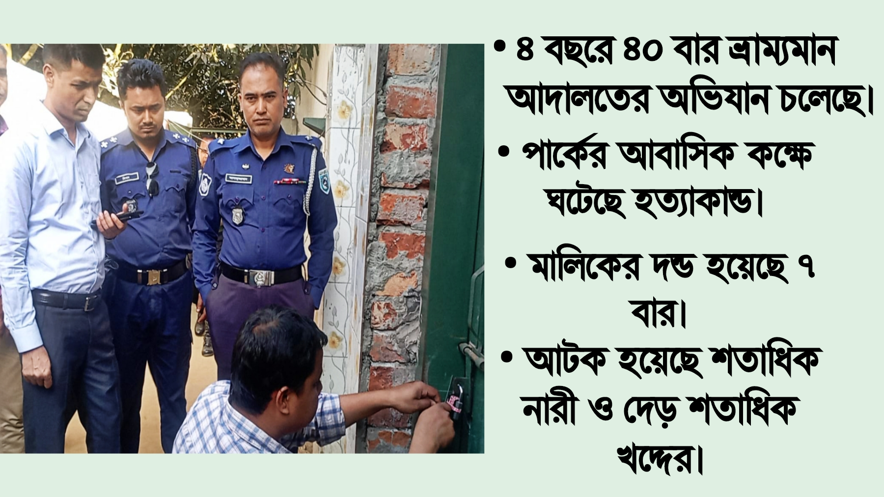 তবে কোন অভিযান কাবু করতে পারেনি পার্ক মালিক মোজামকে। প্রশাসনকে বৃদ্ধাঙ্গুলি দেখিয়ে তিনি বারবার পার্কের আড়ালে সেখানে পতিতাবৃত্তির ব্যবসা চালিয়ে গেছেন। গত ২০২২ সালের ১০ আগস্ট কথিত পার্কটির আবাসিক ক¶ থেকে পার্কের নৈশপ্রহরী ছুরিকাঘাত করা মরদেহ উদ্ধার করেছিল পুলিশ।