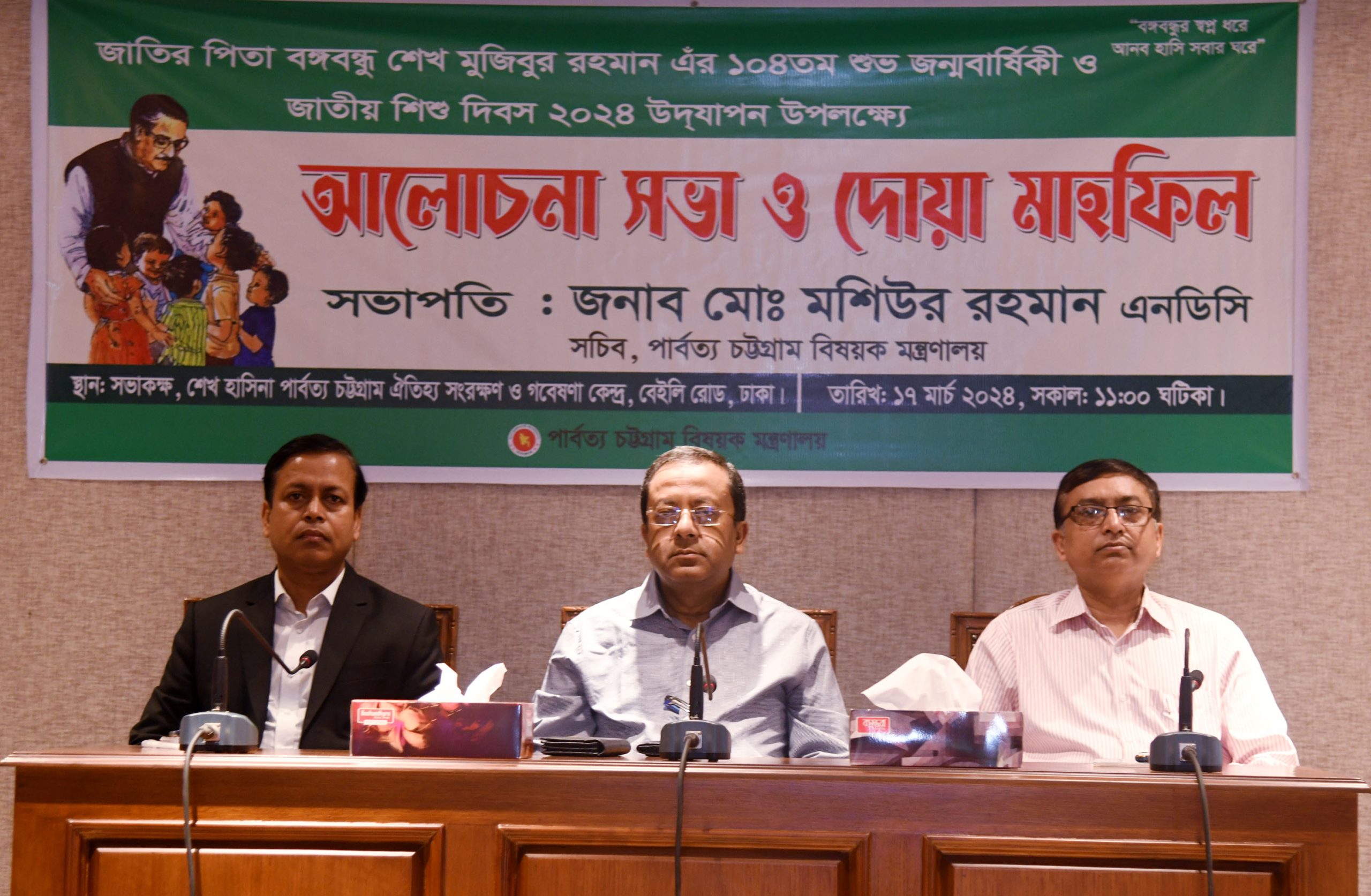 আজ রাজধানীর বেইলী রোডে শেখ হাসিনা পার্বত্য চট্টগ্রাম কমপ্লেক্স ভবনের সভাকক্ষে জাতির পিতা বঙ্গবন্ধু শেখ মুজিবুর রহমানের ১০৪তম জন্মবার্ষিকী ও জাতীয় দিবস-২০২৪ উদযাপন উপলক্ষ্যে আয়োজিত আলোচনা ও দোয়া মাহফিল অনুষ্ঠানে সভাপতির বক্তব্যে পার্বত্য চট্টগ্রাম বিষয়ক মন্ত্রণালয়ের সচিব মো. মশিউর রহমান এনডিসি এসব কথা বলেন।