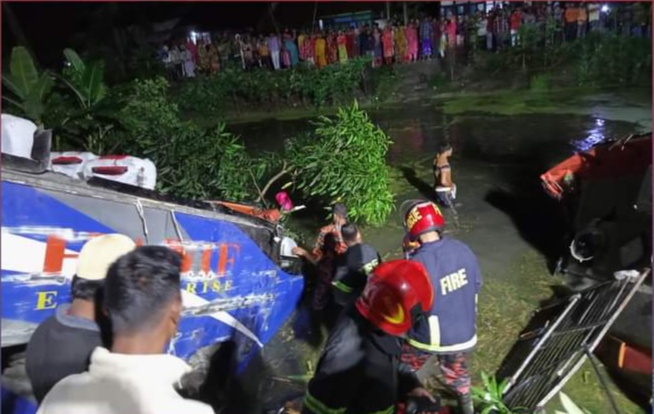 বরিশালের গৌরনদীতে বাস নিয়ন্ত্রণ হারিয়ে ডোবায় পড়ে একজন নিহত ও দশজন আহত হয়েছেন। বৃহস্পতিবার রাত সাড়ে ১০টার দিকে ঢাকা–বরিশাল মহাসড়কে মাহিলাড়া ইউনিয়নের বেজহার এলাকায় এ ঘটনা ঘটে। আহত ব্যক্তিদের গৌরনদী স্বাস্থ্য কমপ্লেক্স ও বরিশালের শের–ই–বাংলা মেডিকেল কলেজ হাসপাতালে ভর্তি করা হয়েছে। আহত যাত্রীরা জানিয়েছেন, ঢাকা থেকে বাস ছাড়ার পর চালক বেপরোয়া গতিতে চালাচ্ছিলেন। যাত্রীরা নিষেধ করলেও করলেও তিনি তা শোনেননি। নিহত সেলিম রেজা (৩৮) যশোরের মনিরামপুর উপজেলার দুর্বাডাঙ্গা গ্রামের আবদুর রশিদের ছেলে। গৌরনদী হাইওয়ে থানার ভারপ্রাপ্ত কর্মকর্তা (ওসি) গোলাম রসুল মোল্লা জানান, ঢাকা থেকে বরিশালের উদ্দেশে ছেড়ে আসা হানিফ পরিবহনের একটি বাস দুর্ঘটনায় পড়ে। বৃহস্পতিবার রাত সাড়ে ১০টার দিকে ঢাকা–বরিশাল মহাসড়কের বেজহার এলাকায় বাসটি নিয়ন্ত্রণ হারিয়ে একাধিকবার উল্টে যায়। এতে বাসটির ছাদ সম্পূর্ণ বিচ্ছিন্ন হয়ে যায়। এটি সড়কের পাশে ডোবায় পড়ে যায়। ঘটনাস্থলে বাসের এক যাত্রী মারা যান। গুরুতর আহত হন আরও ১০ জন।গৌরনদী ফায়ার সার্ভিস স্টেশনের ইনচার্জ বিপুল হোসেন জানান, দুর্ঘটনার খবর পেয়ে ফায়ার সার্ভিসের চারটি ইউনিট, পুলিশ, হাইওয়ে পুলিশসহ স্থানীয় বাসিন্দারা উদ্ধারকাজ শুরু করেন। বাসটি পানিতে পড়ে অর্ধেক ডুবে গিয়েছিল। রাত সাড়ে তিনটার দিকে উদ্ধারকাজ শেষ হয়। আহত ব্যক্তিদের উদ্ধার করে হাসপাতালে পাঠানো হয়।দুর্ঘটনায় আহত আবীর হোসেন (৪০) নামের এক যাত্রী বলেন, ‘চালক দেলোয়ার হোসেন (৩৫) ঢাকা থেকে বাসটি ছাড়ার পর বেপরোয়া গতিতে ছুটছিলেন। আমরা বারবার তাঁকে নিষেধ করলেও তিনি তা শোনেননি। বেপরোয়া গতির কারণে এ দুর্ঘটনা ঘটেছে। ওসি গোলাম রসুল মোল্লা জানান, লাশ উদ্ধার করে শের-ই-বাংলা মেডিকেল কলেজ মর্গে পাঠানো হয়েছে। দুর্ঘটনার পর বাসের চালক ও তাঁর সহকারী পলাতক। এ ঘটনায় মামলার প্রস্তুতি চলছে।