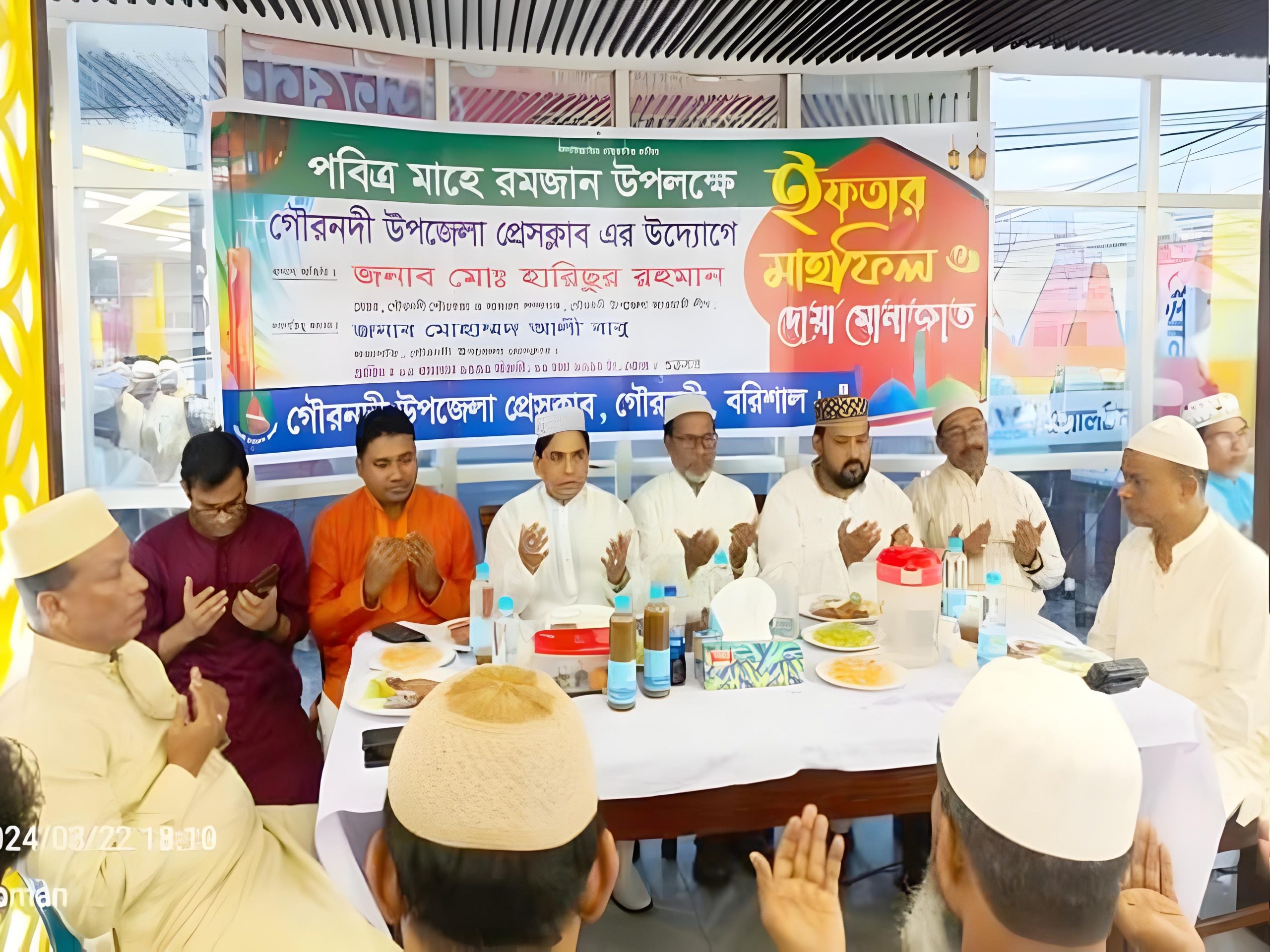 বরিশালের গৌরনদী উপজেলা প্রেসক্লাবের আয়োজনে পবিত্র মাহে রমজান উপলক্ষে ইফতার ও দোয়া-মোনাজাত অনুষ্ঠিত হয়েছে। গৌরনদী উপজেলা প্রেসক্লাবের সভাপতি মোহাম্মদ আলী বাবুর সভাপতিত্বে ২২মর্চ শুক্রবার (১১রমজান)গৌরনদী বাস স্যান্ডে চড়ুই ভাতী রেস্তোরার সভাকক্ষে এ আয়োজন করা হয়েছে। গৌরনদী প্রেসক্লাবের সভাপতি মোঃ লুতফুর রহমান দিপের সঞ্চালনায় ইফতার ও দোয়া-মোনাজাতে প্রধান অতিথি ছিলেন গৌরনদী উপজেলা আওয়ামী লীগের সাধারন সম্পাদক ও পৌরমেয়র মোঃ হারিছুর রহমান হারিছ। বিশেষ অতিথি ছিলেন উপজেলা নির্বাহি কর্মকর্তা মোঃ আবু আবদুল্লাহ খান, সহকারী কমিশনার ভুমি মোঃ রফিকুল ইসলাম, গৌরনদী মডেল থানার অফিসার ইনচার্জ মোঃ আনোয়ার হোসেন, উপজেলা আওয়ামী লীগের সহ-সভাপতি আবু সাঈদ নান্টু, যুগ্ম সাধারন সম্পাদক ভাইস চেয়ারম্যান ফরহাদ হোসেন মুন্সি, উপজেলা মুক্তিযোদ্ধা বিষয়ক সম্পাদক সরদার আবঃ হালিম, গৌরনদী হাইওয়ে ওসি মোঃ গোলাম রসুল, গৌরনদী মডেল থানার পুলিশ পরিদর্শক তদন্ত মোঃ মাজহারুল ইসলাম, গৌরনদী ক্লিনিক এন্ড ডায়াগনস্টিক এসোসিয়েশনের সভাপতি বীর মুক্তিযোদ্ধা এমএ ওহাব, পৌর আওয়ামী লীগের সধারন সম্পাদক আতীকুর রহমান শামীম, উপজেলা যুবলীগের সভাপতি মোঃ আনিচুর রহমান,আগৈলঝাড়া উপজেলা যুবলীগের সাধারণ সম্পাদক মোঃ শহিদ তালুকদার,সহ-সভাপতি আব্দুল্লাহ লিটন, বরিশাল বিভাগীয় সাংবাদিক ঐক্য পরিষদের সহ-সভাপতি বি এম মনির হোসেন, গৌরনদী রিপোর্টার্স ইউনিটির সভাপতি কাজী আল আমীনসহ গৌরনদী রিপোর্টার্স ইউনিটির সাংবাদিক গন, গৌরনদী প্রেসক্লাবের সাধারন সম্পাদক উত্তম কুমার দাসসহ গৌরনদী প্রেসক্লাবের সাংবাদিক গন গৌরনদী উপজেলা প্রেসক্লাবের সাধারন সম্পাদক মোল্লা ফারুক হাসান, সাবেক সভাপতি বদরুজ্জামান খান সবুজ, সহ-সভাপতি আতাউর রহমান চঞ্চলসহ উপজেলা প্রেসক্লাবের সাংবাদিক গন, উপজেলা রিপোর্টার্স ইউনিটির সভাপতি মুহাম্মাদ শাহীন, সধারন সম্পাদক লিটন খানসহ উপজেলা রিপোর্টার্স ইউনিটির সাংবাদিক গন, দৈনিক আজকের খবর পত্রিকার সম্পাদক মোঃ রাজিব ইসলাম তারীম, পৌর ছাত্রলীগের সভাপতি কাউন্সিলর মিলন খলিফা, পৌর স্বেচ্ছাসেবক লীগের সভাপতি মোঃ স্বপন হাওলাদার, কলেজ ছাত্রলীগের সাধারন সম্পাদক শরীফ নাহিয়ান হোসেন রাতুল, উপজেলা ছাত্রলীগের যুগ্ম সাধারন সম্পাদক মোঃ ইমরান মীয়াসহ অনেকে।