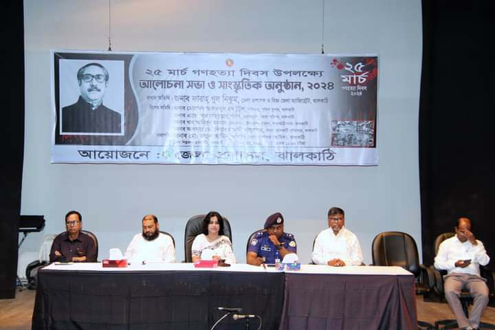 ঝালকাঠি প্রতিনিধি :সোমবার (২৫ মার্চ ) গণহত্যা দিবস ২০২৪ উপলক্ষে ঝালকাঠি জেলা প্রশাসন কর্তৃক আয়োজিত জেলা শিল্পকলা একাডেমিতে আলোচনা সভা ও সাংস্কৃতিক অনুষ্ঠান অনুষ্ঠিত হয়। অনুষ্ঠানে প্রধান অতিথি হিসেবে উপস্থিত ছিলেন জেলা প্রশাসক ফারাহ্ গুল নিঝুম এবং বিশেষ অতিথি হিসেবে উপস্থিত ছিলেন পুলিশ সুপার, মোহাম্মদ আফরুজুল হক টুটুল, (পিপিএম-সেবা), জেলা পরিষদ চেয়ারম্যান আলহাজ্ব খান সাইফুল্লাহ পনির, উপজেলা চেয়ারম্যান আরিফুর রহমান।