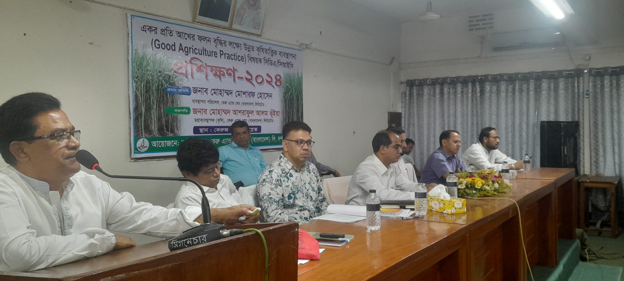 বুধবার সকাল ১০ টায় কেরু এ্যান্ড কোম্পানির কৃষি বিভাগের আয়োজনে কেরুজ ট্রেনিং কমপ্লেক্সে অনুষ্ঠিত এ প্রশিক্ষণের সভাপতিত্ব করেন মহাব্যবস্থাপক কৃষি আশরাফুল আলম ভূইয়া।প্রধান অতিথি হিসেবে উপস্থিত ছিলেন কেরু এ্যান্ড কোম্পানীর ব্যবস্থাপনা পরিচালক মোহাম্মদ মোশারফ হোসেন। প্রধান অতিথি মোহাম্মদ মোশারফ হোসেন তার বক্তব্যে বলেন,আখের ফলন বৃদ্ধির জন্য মাঠ পর্যায়ে আখ চাষীদের নিয়ে কাজ করতে হবে।আখের উন্নত ফলনের জন্য কি কি করণীয় তা আখ চাষীদের বোঝাতে হবে।এসময় বিশেষ অতিথি হিসেবে উপস্থিত ছিলেন যথাক্রমে মহাব্যবস্থাপক (প্রশাসন) মোঃ ইউসুফ আলী, মহাব্যবস্থাপক (অর্থ) আবদুছ ছাত্তার, মহাব্যবস্থাপক (কারখানা) সুমন সাহা, কেরুজ শ্রমিক ও কর্মচারী ইউনিয়নের সভাপতি ফিরোজ আহম্মেদ সবুজ,সাধারণ সম্পাদক মাসুদুর রহমান মাসুদ প্রমুখ।
