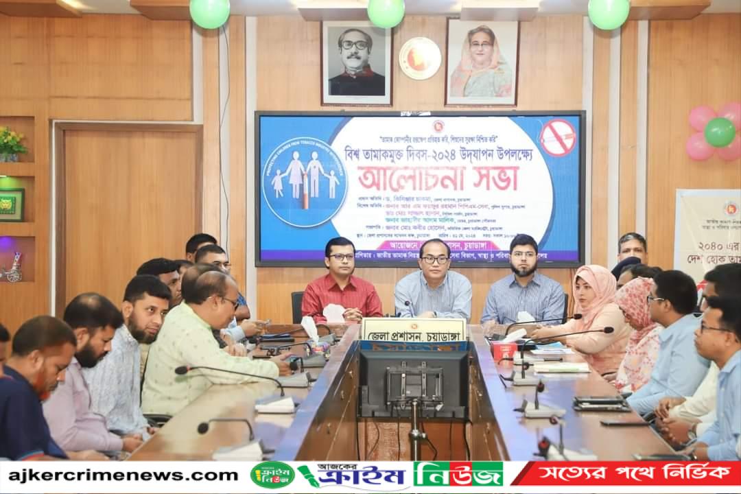শুক্রবার সকাল সাড়ে ৯ টায় বিশ্ব তামাকমুক্ত দিবস ২৪ উদযাপন উপলক্ষে জাতীয় তামাক নিয়ন্ত্রণ সেল, স্বাস্থ্য সেবা বিভাগ, স্বাস্থ্য ও পরিবার কল্যাণ মন্ত্রণালয়ের সার্বিক সহযোগিতায় "তামাক কোম্পানীর হস্তক্ষেপ প্রতিহত করি, শিশুদের সুরক্ষা নিশ্চিত করি" প্রতিপাদ্যে জেলা প্রশাসনের আয়োজনে অতিরিক্ত জেলা ম্যাজিস্ট্রেট মোঃ কবীর হোসেনের সভাপতিত্বে প্রধান অতিথি হিসেবে উপস্থিত ছিলেন চুয়াডাঙ্গা জেলা প্রশাসক ড. কিসিঞ্জার চাকমা।বিশেষ অতিথি হিসেবে উপস্থিত ছিলেন জেলা পুলিশ সুপার আর এম ফয়জুর রহমান, অতিরিক্ত পুলিশ সুপার (প্রশাসন ও অর্থ) মোঃ রিয়াজুল ইসলাম, অতিরিক্ত পুলিশ সুপার (ক্রাইম অ্যান্ড অপস্) মোঃ নাজিম উদ্দিন আল আজাদ, পিপিএম-সেবা, অতিরিক্ত পুলিশ সুপার (সদর সার্কেল); আনিসুজ্জামান,সহকারী পুলিশ সুপার (দামুড়হুদা সার্কেল) জাকিয়া সুলতানা, জেলা পুলিশ ও প্রশাসনের বিভিন্ন পদমর্যাদার কর্মকর্তাবৃন্দ; এনজিও সংস্থা; স্কুল কলেজের শিক্ষক ও শিক্ষার্থীরা।আলোচনার আগে বর্ণাঢ্য র্যালিটি শহরের প্রধান প্রধান সড়ক প্রদক্ষিণ করে।পরে আলোচনা সভা অনুষ্ঠিত হয়। আলোচনা সভায় অতিথি বৃন্দরা একজন ব্যক্তির সামগ্রিক স্বাস্থের উপর সিগারেটসহ অন্যান্য তামাকজাত দ্রব্যের ক্ষতিকারক প্রভাব তুলে ধরেন। তামাক চাষ ও তামাকজাত পণ্যের মারাত্মক স্বাস্থ্য ঝুঁকি, পরিবেশ ও অর্থনৈতিক ক্ষতির বিভিন্ন দিক তুলে ধরে ভবিষ্যৎ প্রজন্মকে তামাকজাত পণ্যের প্রভাব মুক্ত রাখতে পরিবার, শিক্ষা প্রতিষ্ঠান, বিভিন্ন ব্যক্তি ও প্রতিষ্ঠানের গুরুত্বপূর্ণ ভূমিকা তুলে ধরেন। পরিশেষে, তামাকজাত দ্রব্য ও ধূমপান নিয়ন্ত্রণে সকলের সম্মিলিত উদ্যোগ ও সহযোগিতা প্রত্যাশা করেন।