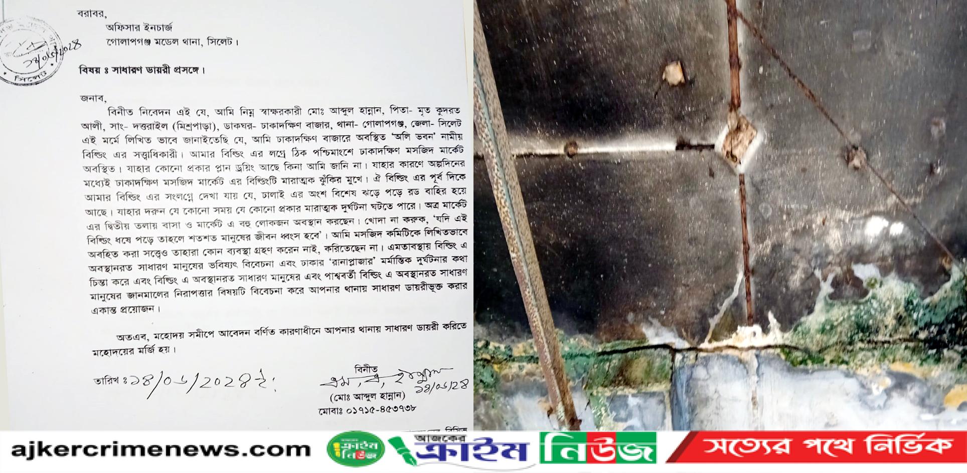 এ ব্যাপারে আব্দুল হান্নান জানান এমতাবস্থায় বিল্ডিং এ অবস্থানরত সাধারণ মানুষের ভবিষ্যৎ বিবেচনা এবং ঢাকার ‘রানাপ্লাজার’ মর্মান্তিক দুর্ঘটনার কথা চিন্তা করে এবং বিল্ডিং এ অবস্থানরত সাধারণ মানুষের এবং পার্শ্ববর্তী বিল্ডিং এ অবস্থানরত সাধারণ মানুষের জানমালের নিরাপত্তার বিষয়টি বিবেচনা করে তিনি গোলাপগঞ্জ থানায় সাধারণ ডায়েরি করেন।