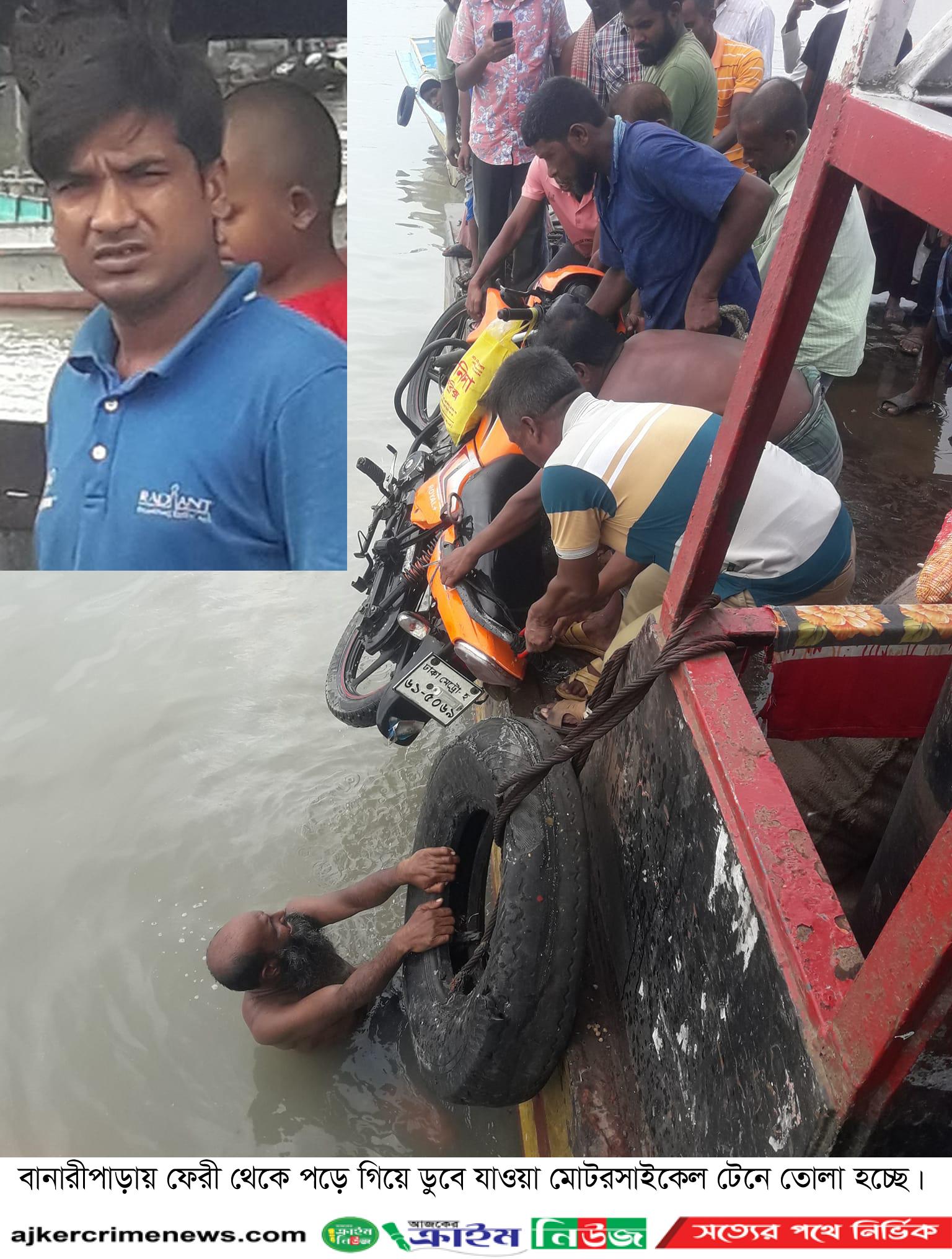 বরিশালের বানারীপাড়ায় চলমান ফেরিতে উঠতে গিয়ে মোটরসাইকেল সন্ধ্যানদীতে পড়ে ডুবে যায়। অল্পের জন্য প্রাণে রক্ষা পেলেন আরোহী পিকুল হাসান। তবে বুকে, হাতে ও পায়ে মারাত্মক চোট পান সে। পিকুল "রেডিয়াম ফার্মাসিউটিক্যালস"র রিপ্রেজেন্টেটিভ। শনিবার (২৯ জুন) বিকাল সোয়া ৪টার দিকে বন্দরবাজার সংলগ্ন ঘাট থেকে ফেরিতে উঠতে গিয়ে এ দুর্ঘটনা ঘটে। জানা যায়, বরিশালে বসবাসকারী ঝিনাইদহের পিকুল হাসান মোটরসাইকেল যোগে বরিশাল থেকে বানারীপাড়া হয়ে ঔষধের স্যাম্পল নিয়ে খেয়া পার হয়ে বাইশারী টু আউয়ার যাওয়ার উদ্দেশে রওনা দিয়ে পৌর শহরের বন্দর বাজার সংলগ্ন সন্ধ্যানদীর ফেরিঘাটে আসে। এ সময় ফেরিও ছেড়ে যাচ্ছিল। ফেরিটি ঘাট থেকে তিন ফুট (দুই হাত) দূরত্বে চলে যাওয়ার পর পিকুল রানিংয়ে থাকা মোটরসাইকেল নিয়ে ফেরিতে উঠতে গেলে সামনের চাকা চলমান ফেরির উপরে পড়ে এবং পেছনের চাকা শূন্যে থাকে। এ সময় ফেরির অন্য যাত্রীরা মোটরসাইকেল আরোহী পিকুল হাসানকে টেনে তুললেও মোটরসাইকেলটি পানিতে পড়ে ডুবে যায়। এ ঘটনায় পিকুল বুক, হাতে ও পায়ে মারাত্মক চোট পায় ও জখম হয়। মোটরসাইকেলটি তাৎক্ষণিক খেয়া চালকদের সহযোগিতায় দড়ি বেঁধে ফেরির ওপর টেনে তোলা হয়।।