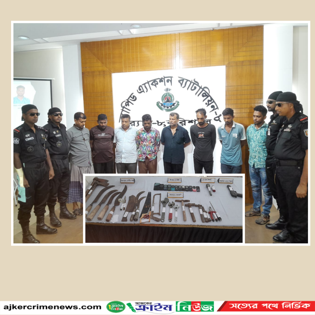 বিপুল পরিমাণ দেশীয় অস্ত্র ও ডাকাতির সরঞ্জামাদিসহ ডাকাতির প্রস্তুতিকালে আন্তঃজেলা ডাকাত দলের কুখ্যাত সর্দার আব্দুল হাকিম ও অন্যতম প্রধান সহযোগী সোহাগসহ ৮ জনকে গ্রেফতার করেছে র্যাব-৮ ও র্যাব- ১০।