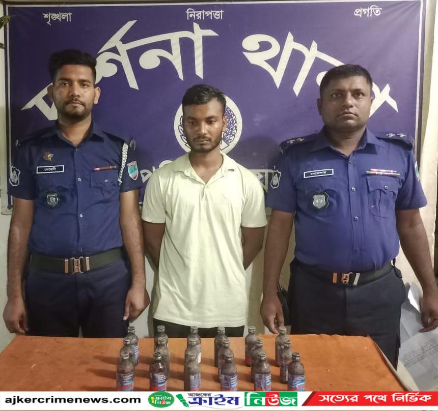 মঙ্গলবার ভোরে দর্শনা থানার অফিসার ইনচার্জ বিপ্লব কুমার সাহার নেতৃত্বে দর্শনা থানার এসআই (নিঃ) মোঃ সেকেন্দার আবু জাফর সঙ্গীয় অফিসার ও ফোর্সসহ পৌর এলাকার আজমপুরে এক মাদক বিরোধী অভিযান চালায়। এসময় আজমপুর কবরস্থানের সামনে থেকে একই এলাকার অঃ সাত্তারের ছেলে মোঃ আল আমিন (২৪) কে গ্রেফতার করে। পরে তার দেহে বিশেষ কায়দায় রাখা ১৮ বোতল ফেন্সিডিল উদ্ধার করা হয়। পরে গ্রেফতারকৃত আসামীর বিরুদ্ধে দর্শনা থানায় মামলা করা হয়েছে।