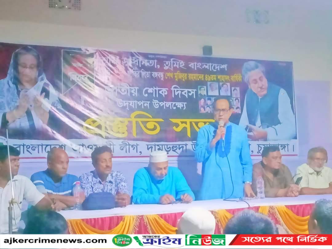 চুয়াডাঙ্গা প্রতিনিধিঃ দামুড়হুদা উপজেলা আওয়ামী লীগের আয়োজনে ১৫ আগস্ট জাতির পিতা বঙ্গবন্ধু শেখ মুজিবুর রহমানের ৪৯ তম শাহাদৎ বাষির্কী ও জাতীয় শোক দিবস ২০২৪ উদযাপন শোকাবহ আগষ্ট মাসব্যাপী সকল কর্মসূচি নিয়ে প্রস্তুতিমূলক সভা অনুষ্ঠিত হয়েছে।