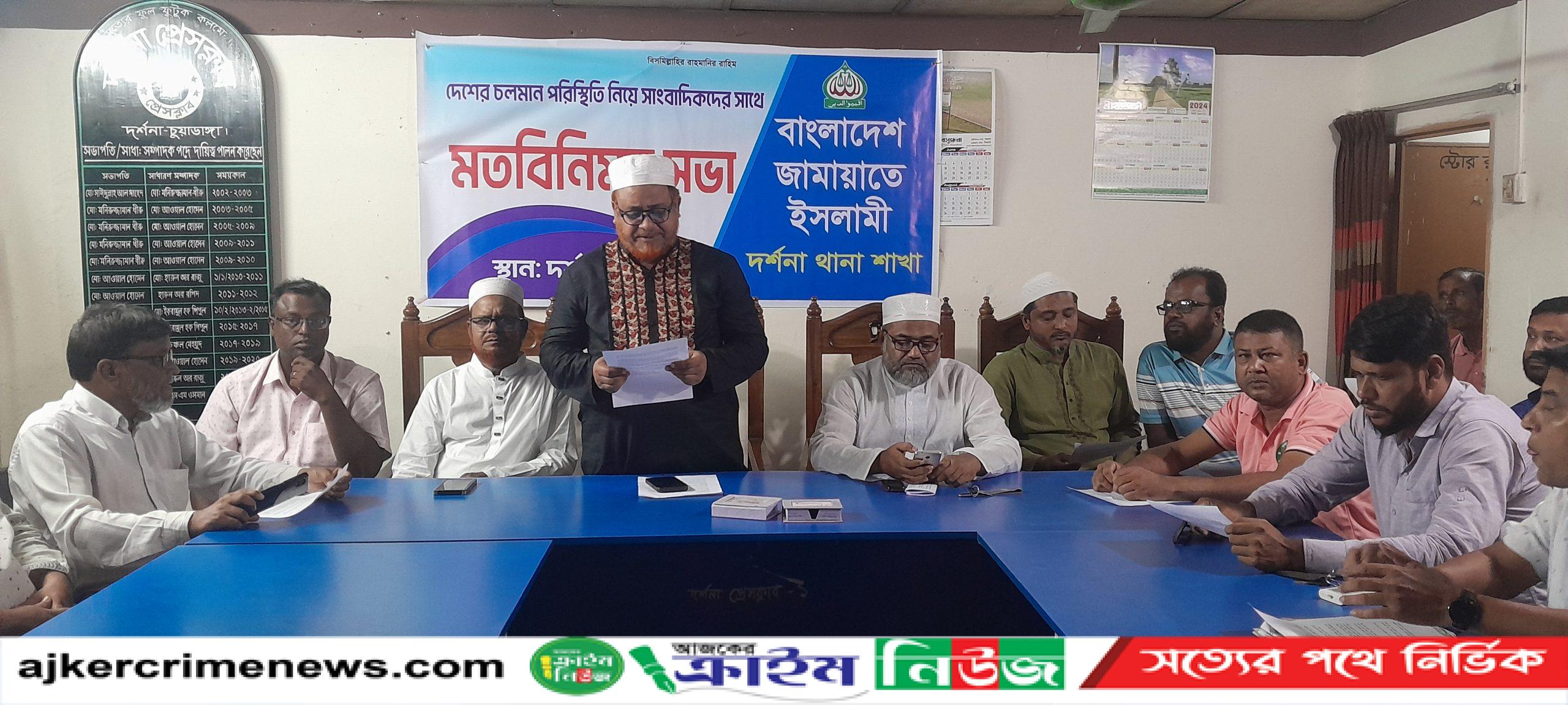 সোমবার সন্ধ্যা ৭টায় দর্শনা প্রেসক্লাবে অনুষ্ঠিত এ মত বিনিময় সভার সভাপতিত্ব করেন দর্শনা থানা শাখা আমীর রেজাউল করিম।প্রধান অতিথি হিসেবে উপস্থিত ছিলেন বাংলাদেশ জামায়াতে ইসলামীর চুয়াডাঙ্গা জেলা আমীর এ্যাঃ মোঃ রুহুল আমীন।বিশেষ অতিথি হিসেবে উপস্থিত ছিলেন চুয়াডাঙ্গা জেলা সেক্রেটারী এ্যাডঃ আসা দুজ্জামান ,সহকারী সেক্রেটারি এ্যাঃ মাসুদ পারভেজ রাসেল ,সহ সেক্রেটারী আঃ কাদের,দর্শনা থানা সেক্রেটারি মাহবুবুর রহমান টুকু,দর্শনা পৌর আমীর আজিজুল হক,সাবেক সেক্রেটারি মোঃ গোলজার হোসেন প্রমুখ উপস্থিত ছিলেন। সাংবাদিকদের মধ্যে দর্শনা প্রেসক্লাবের সভাপতি ইকরামুল হক পিপুল,
