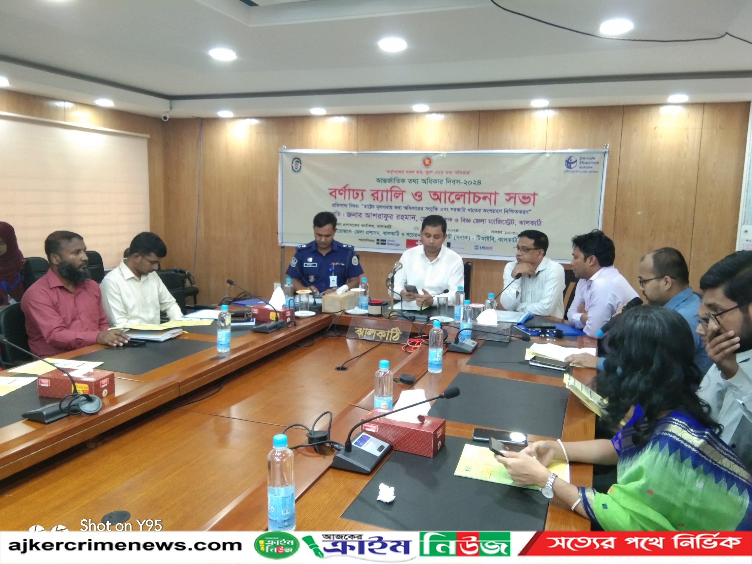 ঝালকাঠি জেলা প্রশাসন ও সচেতন নাগরিক কমিটি (সনাক), ঝালকাঠির যৌথ আয়োজনে আন্তর্জাতিক তথ্য অধিকার দিবস ২০২৪ উদযাপন উপলক্ষ্যে আয়োজিত এক আলোচনা সভায় সভাপতির বক্তব্যে তিনি একথা বলেন। ২৮ সেপ্টেম্বর (শনিবার) সকাল ১১টায় জেলা প্রশাসকের সম্মেলন কক্ষে অনুষ্ঠিত হয় উক্ত সভা।