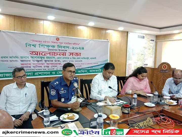 ঝালকাঠি প্রতিনিধি :ঝালকাঠি জেলা প্রশাসকের কার্যালয়ের সম্মেলন কক্ষে বিশ্ব শিক্ষক দিবস - ২০২৪ উপলক্ষে "শিক্ষকের কন্ঠস্বর: শিক্ষায় নতুন সামাজিক অঙ্গীকার" এই স্লোগানকে সামনে নিয়ে শনিবার ৫ই অক্টোবর সকালে আলোচনা সভা ও র্যালি অনুষ্ঠিত হয়। আলোচনা সভায় প্রধান অতিথি হিসেবে উপস্থিত ছিলেন জেলা প্রশাসক আশরাফুর রহমান, বিশেষ অতিথি হিসেবে উপস্থিত ছিলেন পুলিশ সুপার উজ্জ্বল কুমার রায়, ও অতিরিক্ত জেলা প্রশাসক (শিক্ষা ও আইসিটি) সাজিয়া আফরোজ।