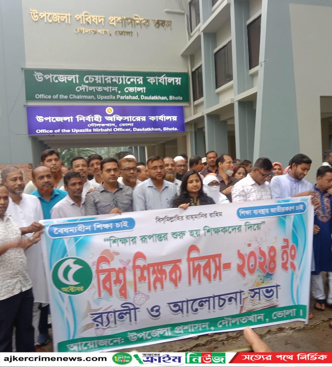 ভোলার দৌলতখানে যথাযথ মর্যাদায় বিশ্ব শিক্ষক দিবস পালিত হয়েছে। এ-উপলক্ষে দৌলতখান উপজেলা প্রশাসন দিবসটি পালনে র্যালি ও আলোচনা সভার আয়োজন করে। উপজেলার বিভিন্ন কলেজ ও মাধ্যমিক বিদ্যালয়ের শিক্ষকরা উপস্থিত ছিলেন। উপজেলা প্রশাসন চত্বরে আয়োজিত র্যালিতে বক্তব্য রাখেন, উপজেলা নির্বাহী অফিসার নিয়তি রাণী কৈরি, দৌলতখান সরকারি আবু আবদুল্লাহ কলেজের প্রভাষক আসমা আকতার, হালিমা খাতুন মহিলা কলেজর প্রভাষক গিয়াসউদ্দিন, হাজীপুর ফাজিল ডিগ্রি মাদ্রাসার উপাধ্যক্ষ মাওঃ অলিউল্লাহ, জয়নাল আবদিন ল্যাবরেটরী মাধ্যমিক বিদ্যালয়ের প্রধান শিক্ষক আবদুল্লাহ আল নোমান, প্রাথমিক বিদ্যালয়ের শিক্ষক নেতা শহিদুল্লাহ নয়ন প্রমুখ।