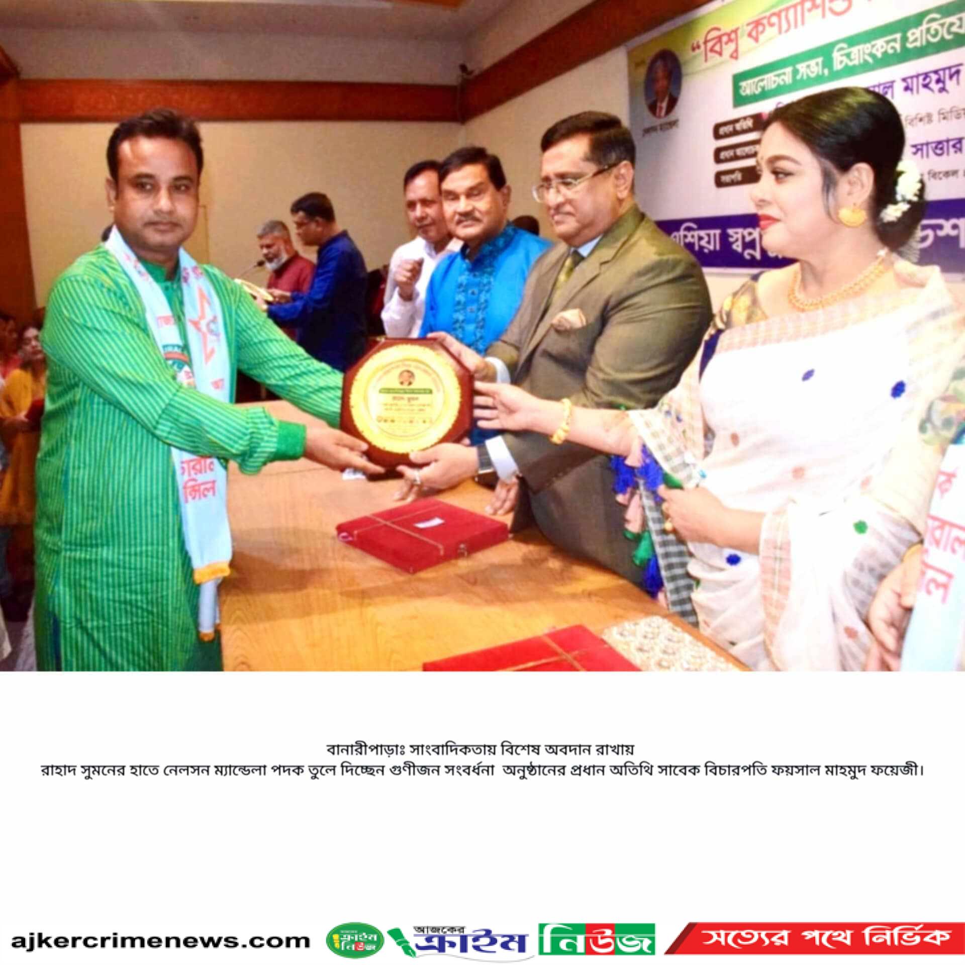 মফস্বল সাংবাদিকতায় বিশেষ অবদান রাখায় বরিশালের বানারীপাড়া প্রেসক্লাব সভাপতি নির্ভীক সাংবাদিক রাহাদ সুমন নেলসন ম্যান্ডেলা পদক পাওয়ার গৌরব অর্জন করেছেন। শনিবার (১৯ অক্টোবর) বিকালে ঢাকার শাহবাগে জাতীয় জাদুঘরের কবি সুফিয়া কামাল মিলনায়তনে গুণীজন সংবর্ধনা অনুষ্ঠানে প্রধান অতিথি বাংলাদেশ সুপ্রীম কোর্টের সাবেক বিচারপতি ফয়সাল মাহমুদ ফয়েজীসহ বিশেষ অতিথিরা সাংবাদিক রাহাদ সুমনের হাতে নেলসন ম্যান্ডেলা পদক (ক্রেষ্ট), সনদ ও উত্তরীয় তুলে দেন। বিশ্ব শিশুকন্যা দিবস-২০২৪ উদযাপন উপলক্ষে এশিয়া স্বপ্নপুরী ফাউন্ডেশন ও সার্ক কালচারাল কাউন্সিলের উদ্যোগে আলোচনা সভা, চিত্রাংকন প্রতিযোগীতা, আবৃত্তি, গুণীজন সংবর্ধনা ও সাংস্কৃতিক অনুষ্ঠানের আয়োজন করা হয়। অনুষ্ঠানে প্রধান আলোচক ছিলেন জাসাস কেন্দ্রীয় নির্বাহী কমিটির সাবেক সভাপতি বিশিষ্ট মিডিয়া ও সাংস্কৃতিক ব্যক্তিত্ব রেজাবুদৌলা চৌধুরী, আইইউবিএটি'র প্রফেসর ড.এম এ সাত্তার, এটিএন বাংলার উপদেষ্টা (অনুষ্ঠান) তাশিক আহমেদ, গাজিপুর রেসিডেন্সিয়াল স্কুল অ্যান্ড কলেজের অধ্যক্ষ
