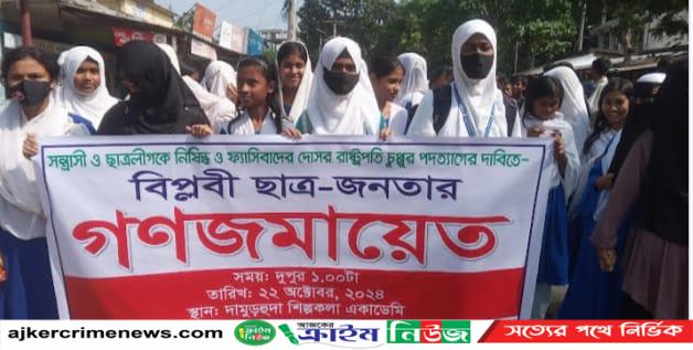 মঙ্গলবার দুপুর ১ টায় দামুড়হুদা উপজেলা শিল্পকলা একাডেমীর সামনে বৈষম্য বিরোধী ছাত্র আন্দোলন দামুড়হুদার উদ্যোগে বিপ্লবী ছাত্র জনতার গণজমায়েত অনুষ্ঠিত হয়।গণজমায়েতে উপস্থিত বক্তারা, রাষ্ট্রপতি চুপ্পুকে ফ্যাসিবাদ হাসিনা সরকারের দোসর ও গণহত্যার প্রতিবাদে ছাত্রলীগকে সন্ত্রাসী সংগঠন বলে বিভিন্ন স্লোগান দেন এবং অনতিবিলম্বে রাষ্ট্রপতির পদত্যাগ ও ছাত্রলীগকে নিষিদ্ধ করার দাবি তোলেন।