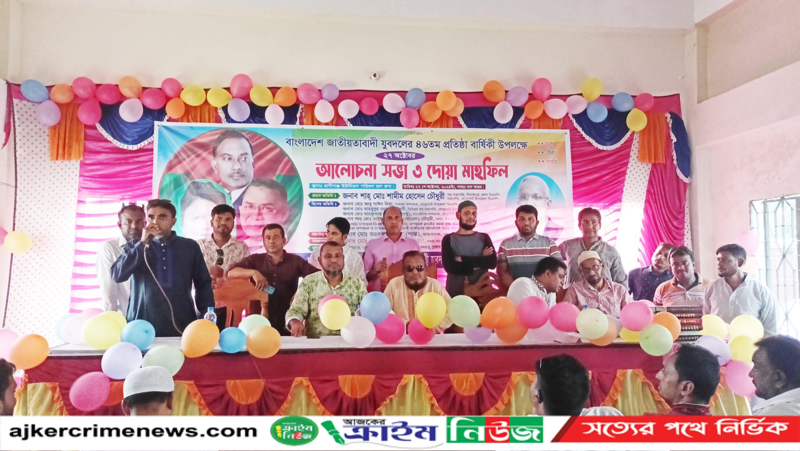 দিনাজপুরের ঘোড়াঘাটে যুবদলের ৪৬ তম প্রতিষ্ঠাবার্ষিকী উপলক্ষে আলোচনা সভা ও দোয়া মাহফিল অনুষ্ঠিত হয়েছে।