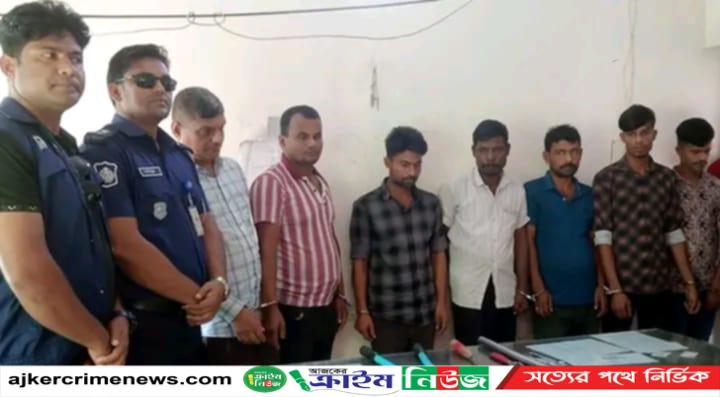 বরিশালের গৌরনদীতে ডাকাতির প্রস্তুতিকালে দেশীয় অস্ত্রসহ সাতজনকে আটক করা হয়েছে। রোববার (৩ নভেম্বর) রাত সোয়া ৩টার দিকে গৌরনদী মডেল থানা পুলিশের একটি টহল দল তাদের আটক করেন।আটককৃতরা হলেন- উপজেলার পূর্ব গরঙ্গল এলাকার মৃত সোনামদ্দিন খানের ছেলে কালাম খান (৪৫), আনোয়ার বেপারীর ছেলে আকাশ বেপারী (২৫), নাজিরপুর শংকরপাশা গ্রামের সামসুল হক ফকিরের ছেলে উজ্জ্বল ফকির (৩৫), কুতুবপুর গ্রামের মৃত ইউনুস খানের ছেলে ফয়সাল খান (২৭), ব্রাহ্মণবাড়িয়া জেলার নবীনগর থানার সেমন্তঘর এলাকার জহর হকের ছেলে রুবেল মিয়া (২৬), উজিরপুর উপজেলার কালিহাতা গ্রামের মৃত শরীফ আলীর ছেলে সাইফুল ইসলাম (৩৫) ও নথুল্লাবাদ এলাকার মৃত ছলেমান খার ছেলে টিপু খা ওরফে টুকু (৪০)।