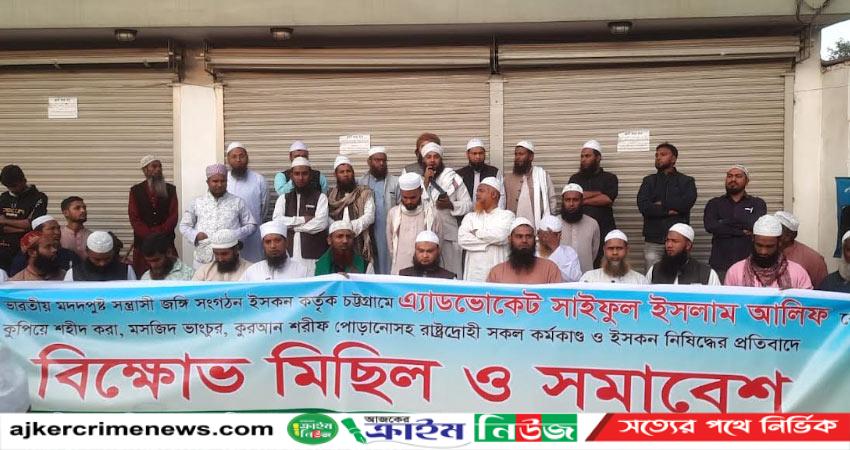 চট্টগ্রামে এ্যাড. সাইফুল ইসলাম আলিফকে ভারতীয় মদদপুষ্ট সন্ত্রাসী সংগঠন ইসকন কর্তৃক কুপিয়ে শহীদ,মসজিদ ভাংচুর, কুরআন পোড়ানোসহ রাষ্ট্রদ্রোহী কর্মকান্ডের প্রতিবাদে বিক্ষোভ মিছিল ও সমাবেশ অনুষ্ঠিত হয়।