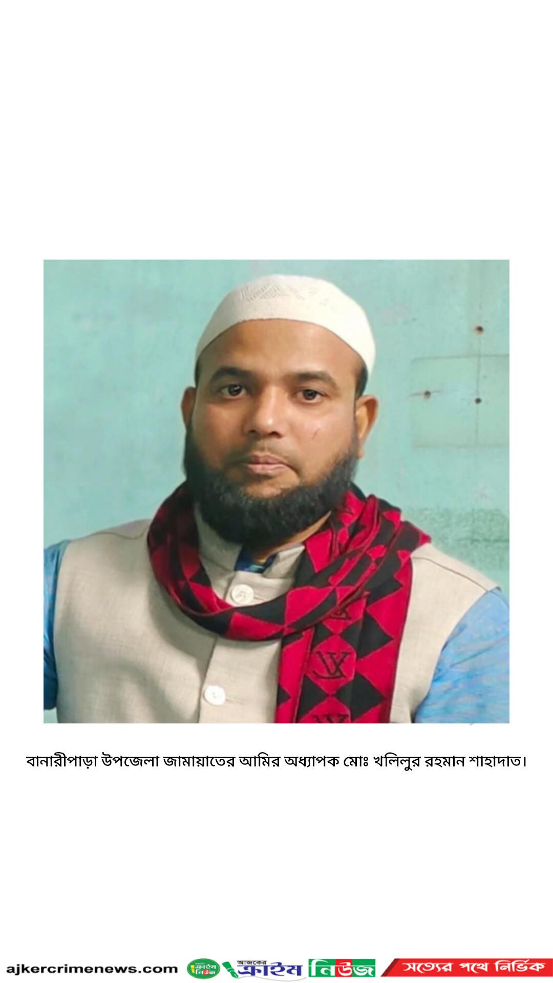 জামায়াতে ইসলামীর আমির পুনঃনির্বাচিত হয়েছেন। শুক্রবার (২৯ নভেম্বর) বিকালে বানারীপাড়া উপজেলা জামায়াতের কার্যালয়ে অনুষ্ঠিত দ্বি-বার্ষিক রোকন সম্মেলনে রুকনদের সরাসরি ভোটে ২০২৫-২৬ সেশনের জন্য তিনি আমির পুনঃনির্বাচিত হন।