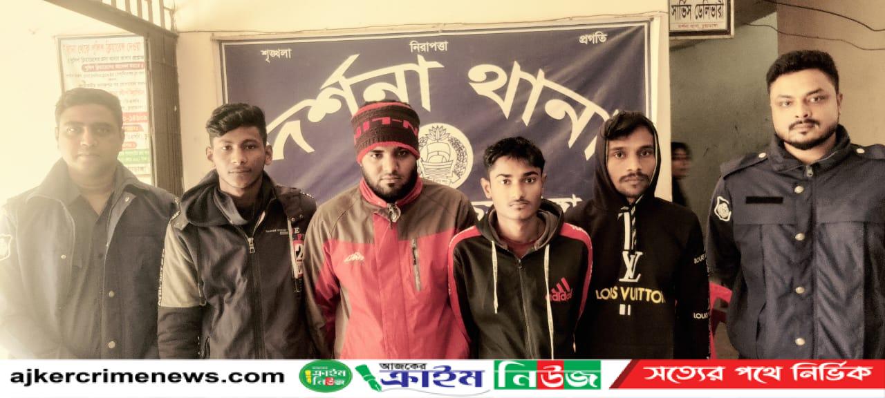 শনিবার সকালে দর্শনা থানার অফিসার ইনচার্জ শহীদ তিতুমীরের নেতৃত্বে পুলিশ দর্শনার আকুন্দবাড়িয়ায় এক অভিযান চালিয়ে মোবাইল কোর্টের মাধ্যমে ৫ দিনের সাজা প্রাপ্ত আসামী চুয়াডাঙ্গা সদরের ভিমরুল্লাহ গ্রামের বিশরত আলীর ছেলে নিজেকে অনলাইন ক্রাইম নিউজের সাংবাদিক পরিচয় দানকারী মোঃ মইনুদ্দিন চঞ্চল (৪২)কে গ্রেফতার করে। এর আগে বিভিন্ন মামলার আসামী কুড়ুুলগাছি গ্রামের আঃ রহিমের ছেলে মোঃ জামশেদ (২৮), দর্শনার রামনগর গ্রামের আয়ুব আলীর ছেলে মোঃ হেলাল উদ্দিন (২৮), পারকৃষ্ণপুর গ্রামের আশরাফুল হকের ছেলে মোঃ সৌরভ (১৮) ও নাস্তিপুর গ্রামের আনোয়ার হোসেনের ছেলে