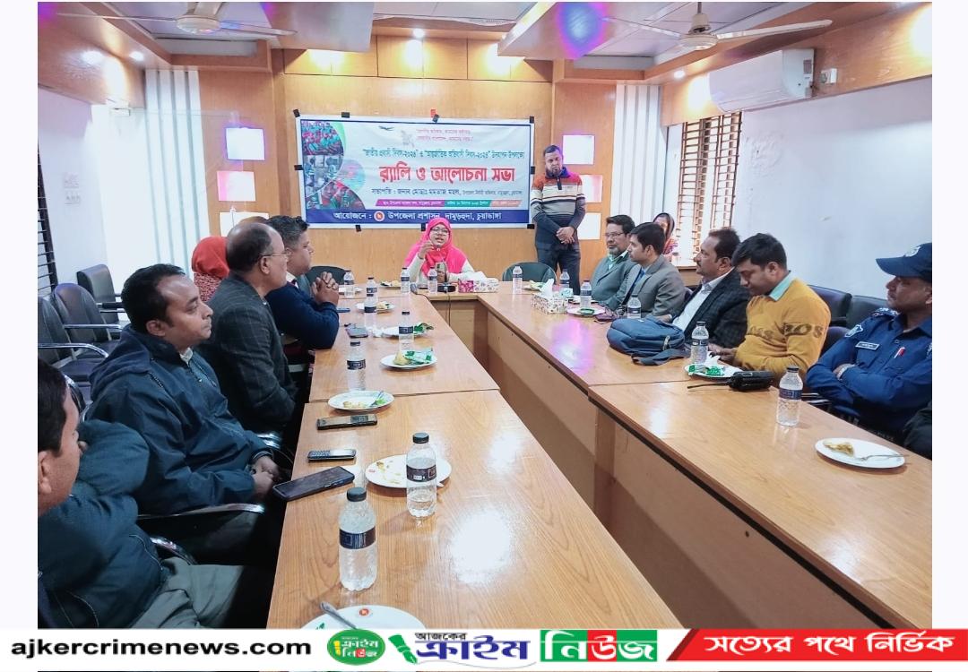 বুধবার সকাল সাড়ে ১০ টায় দামুড়হুদা উপজেলা প্রশাসনের আয়োজনে উপজেলা চত্বর থেকে একটি র্যালী বের হয়। পরে র্যালী শেষে পরিষদের সভাকক্ষে আলোচনা সভা অনুষ্ঠিত হয়েছে।উক্ত আলোচনা সভার সভাপতিত্ব করেন দামুড়হুদা উপজেলা নির্বাহী কর্মকর্তা মমতাজ মহল।এসময় অন্যান্যদের মধ্যে উপস্থিত ছিলেন উপজেলা সমাজ সেবা কর্মকর্তা তোফাজ্জল হোসেন, প্রকৌশলী কর্মকর্তা আব্দুর রশিদ, সমবায় কর্মকর্তা হারুন অর রশীদ, মহিলা বিষয়ক কর্মকর্তা হোসনে জাহান, যুব উন্নয়ন কর্মকর্তা জাহাঙ্গীর আলম, দামুড়হুদা সাংবাদিক সমিতির সভাপতি হাফিজুর রহমান কাজল,দামুড়হুদা মডেল থানার প্রতিনিধি এস আই মাহাবুল, এনজিও ব্রাক প্রতিনিধি নিজাম উদ্দিন, ওয়েভ ফাউন্ডেশন প্রতিনিধি মিরাজুল ইসলামসহ উপজেলার বিভিন্ন দপ্তরের কর্মকর্তা কর্মচারিবৃন্দ। দামুড়হুদা উপজেলা নির্বাহী কর্মকর্তা মমতাজ মহল